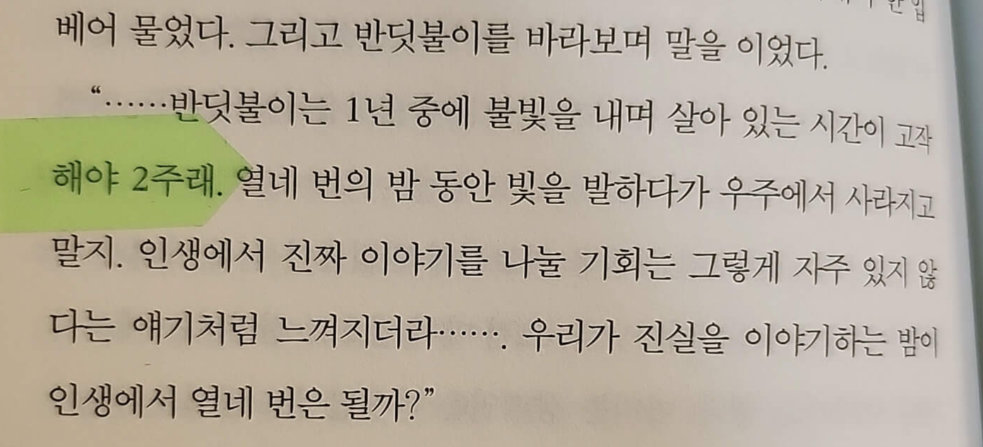 "수혁아, 몇 시간이고 이야기할 수 있는 사람을 만나라. 깊은 우물 속 같은 마음을 꺼내며 밤새도록 이야기 나눌 수 있는 사람이면 되는 거야. 아버지가 살아보니까 그렇더라. 화려한 시절도 지나가고, 미칠 듯한 열정과 환희의 순간도 빛이 바래지. 하지만 이야기는 영원히 남아. 이야기는 마음속에 남는 거니까. 어디 닳아서 없어지지도 않고, 깨어서 부서지지도 않더라......"