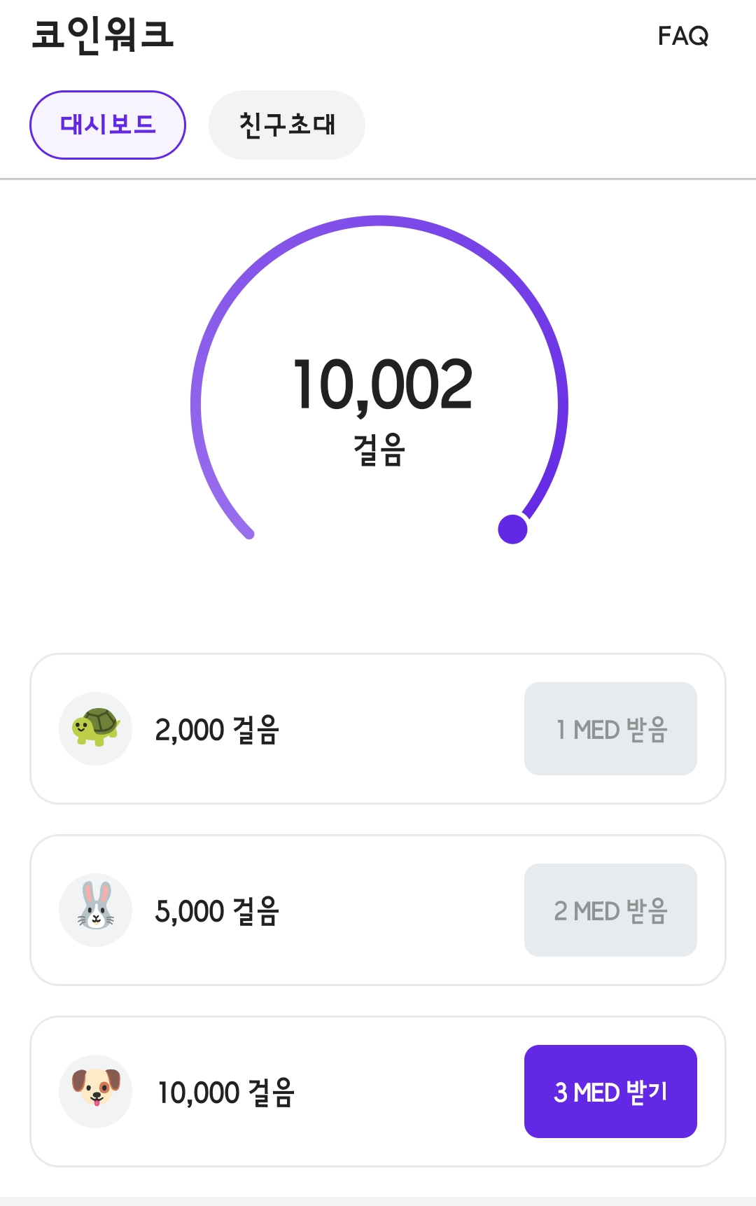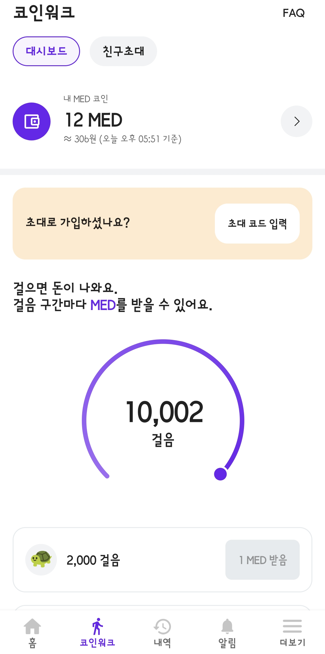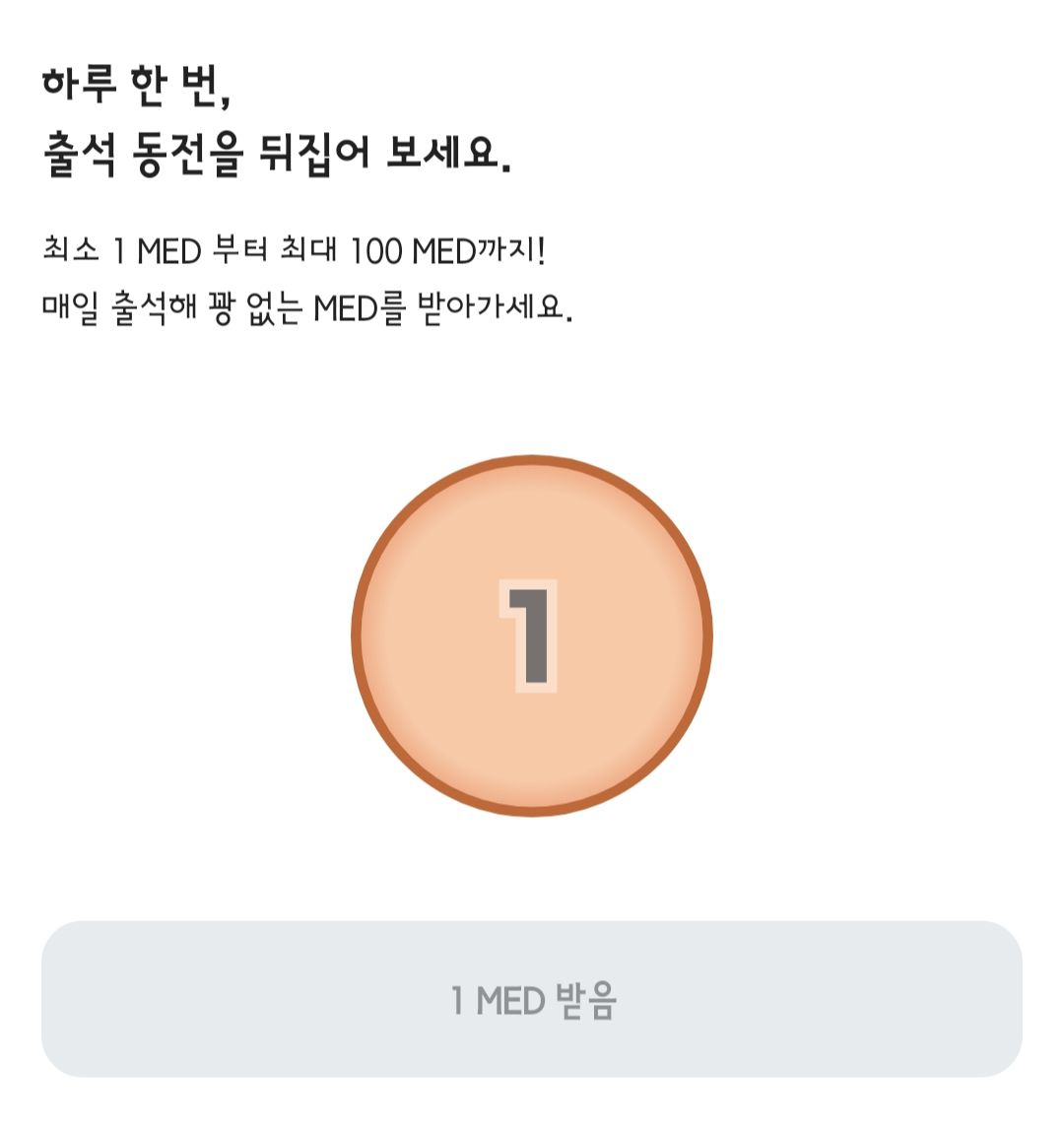 하루에 만보를 걸으면 6 MED를 얻을 수 있고, 또 하루에 한 번 동전 뒤집기를 통해 최소 1 MED (최대 100 MED)를 얻을 수 있기 때문에 하루에 만보를 걷는다면 약 7 MED를 받을 수 있습니다.
