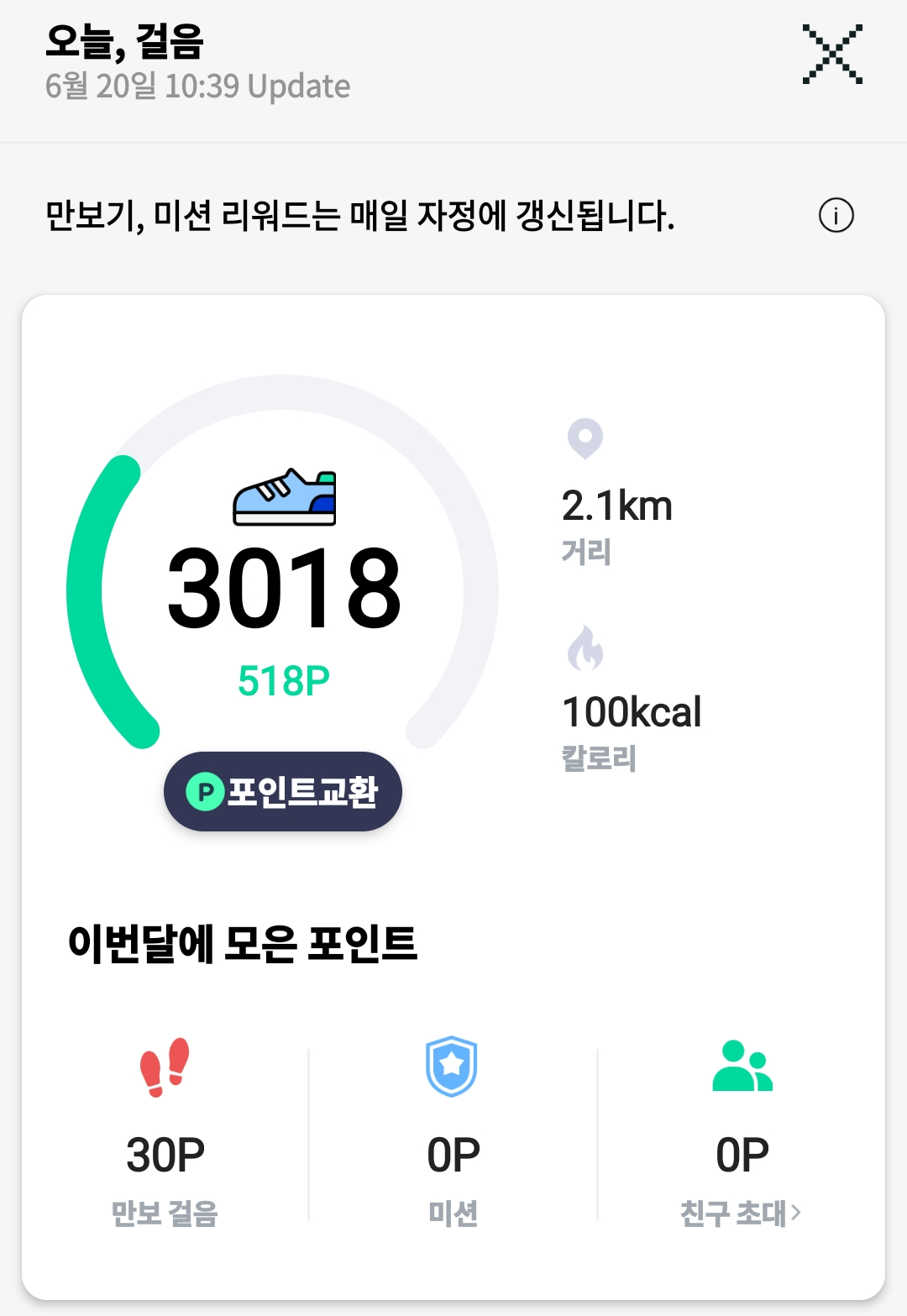 10 걸음 10원, 5천 걸음 10원, 만보 걸으면 20원으로, 총 만보를 걸으면 40원을 받을 수 있고, 주변 장소 가기 등 추가 미션을 완료하면 약 100원 이상을 더 얻을 수 있습니다.