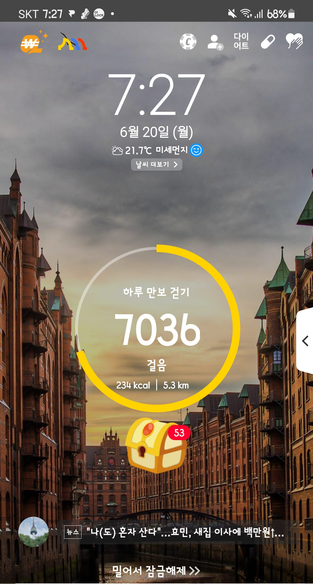 캐시워크는 100보를 걸으면 1포인트가 지급됩니다. 스마트폰 잠금화면에 보물 상자를 클릭하면 1포인트씩 올라가는 것을 확인할 수 있습니다.