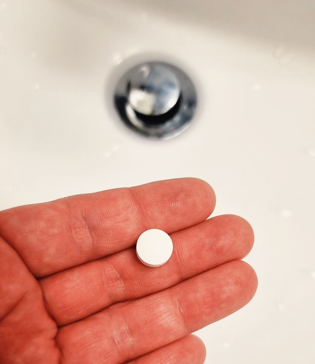1. 고체 치약 1개를 입안에 넣고 어금니로 반을 쪼개서 양쪽 어금니로 꼭꼭 씹어 줍니다.