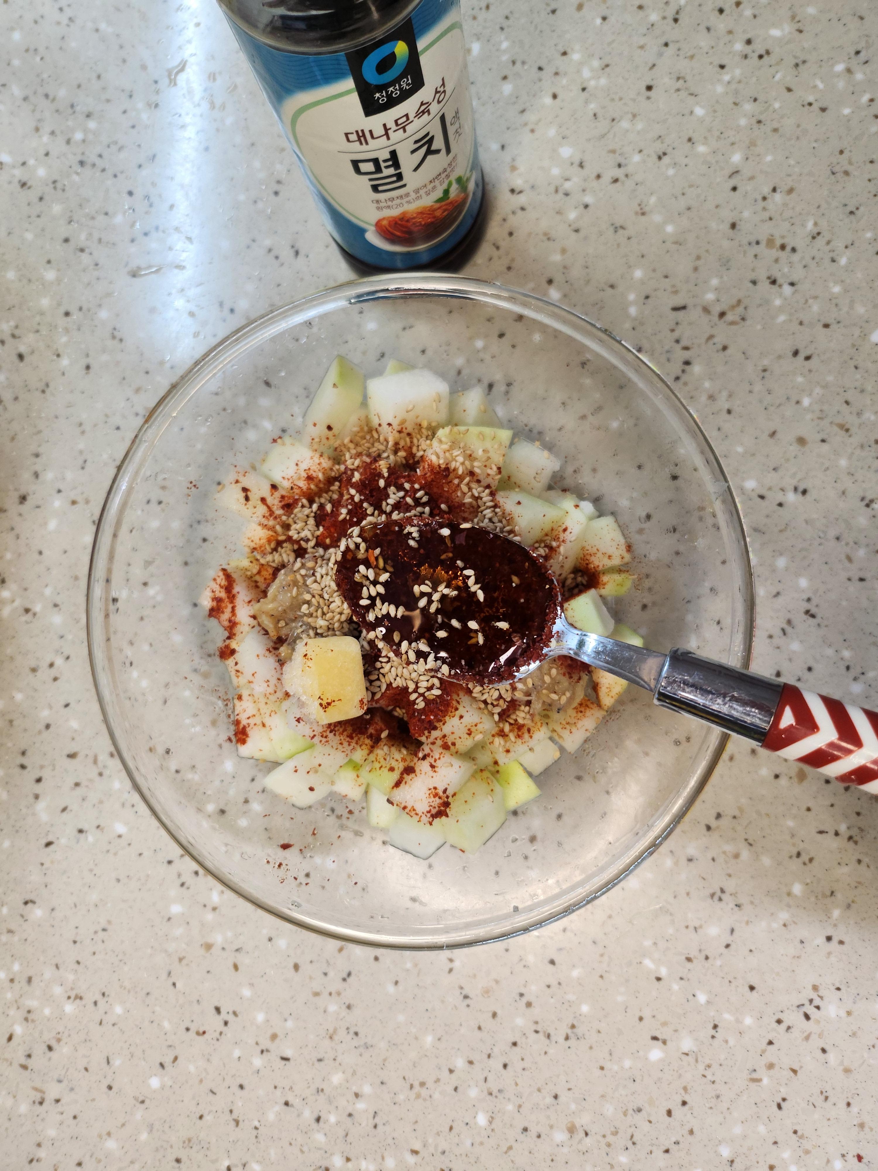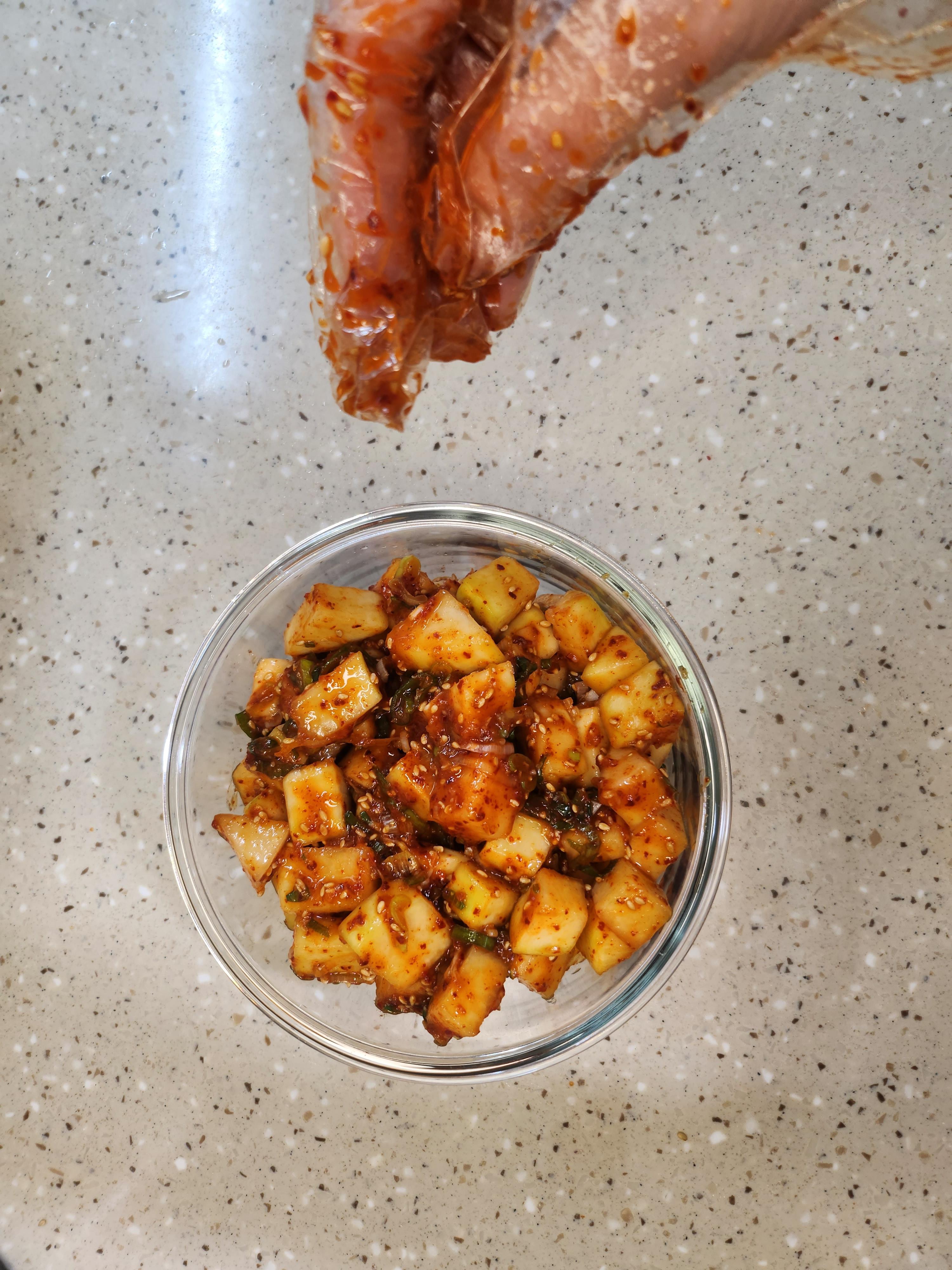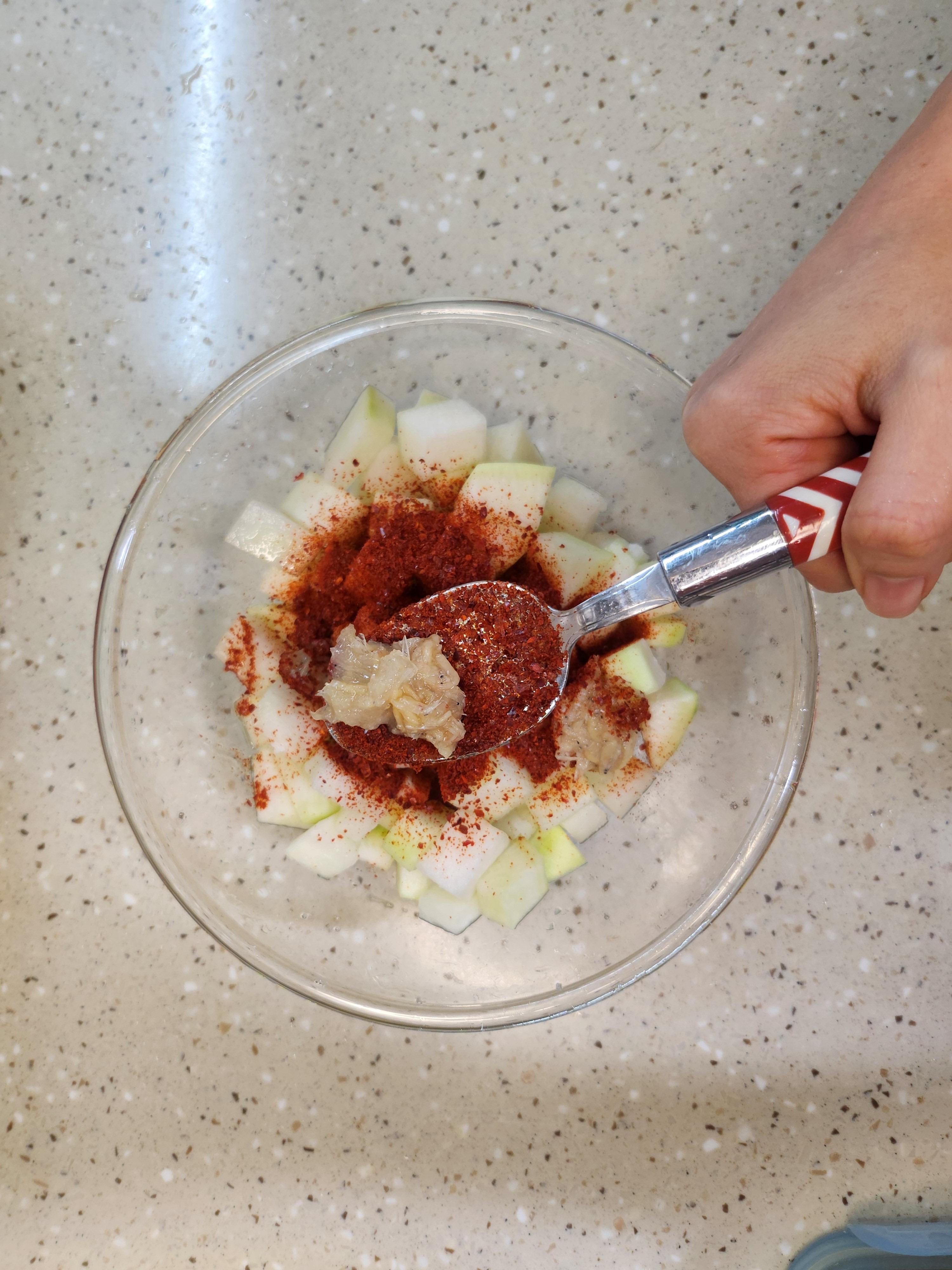 깍두기 앙념 : 고춧가루 3큰술, 액젓1큰술, 설탕1큰술, 매실청1큰술, 마늘1큰술, 깨 1큰술