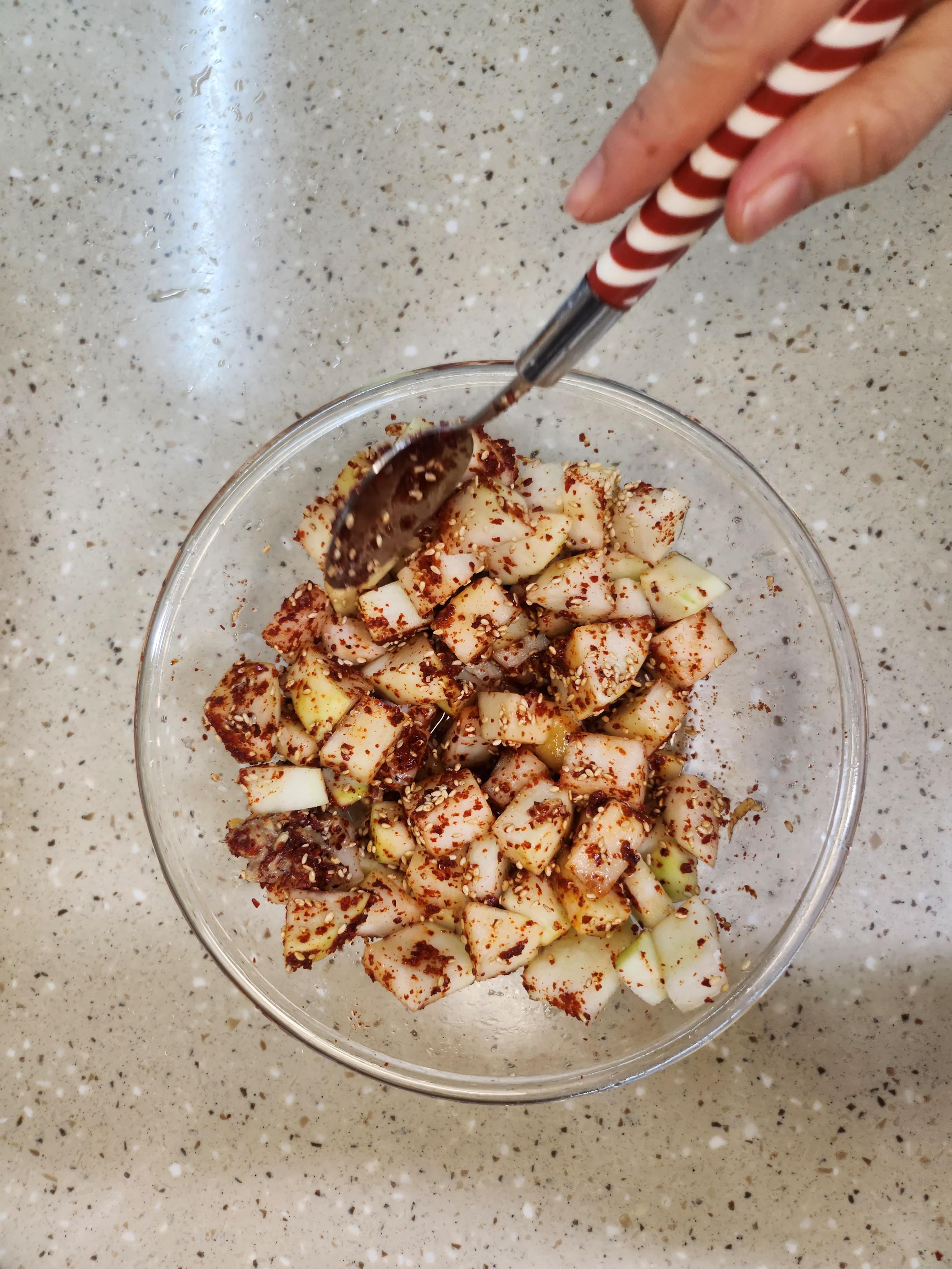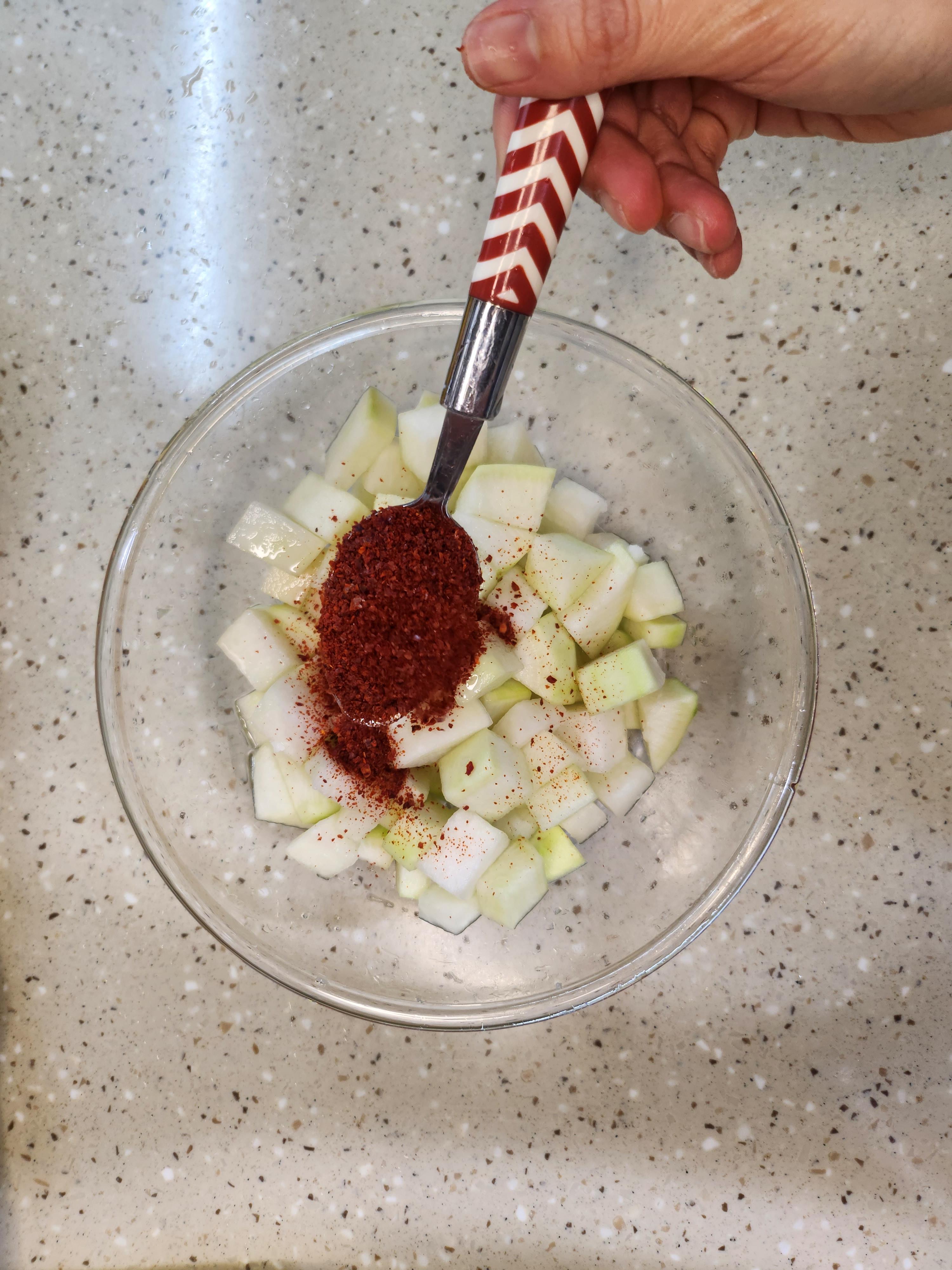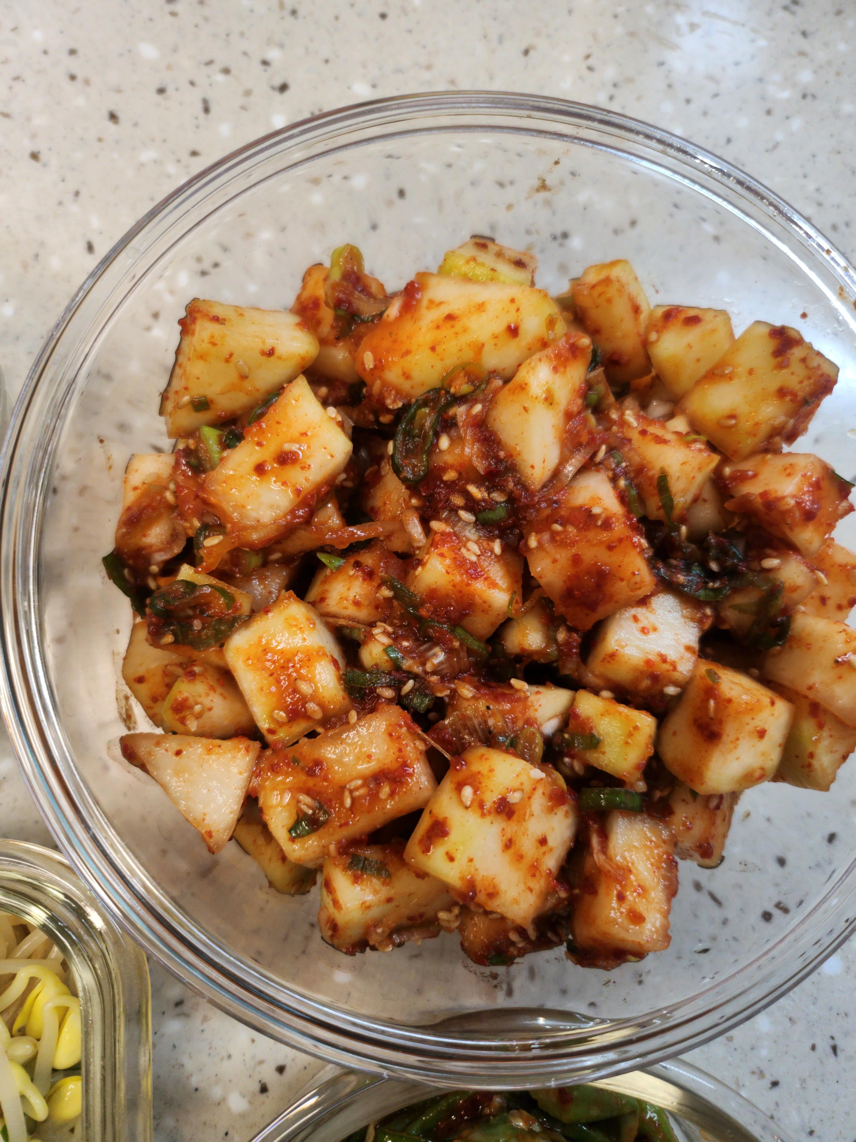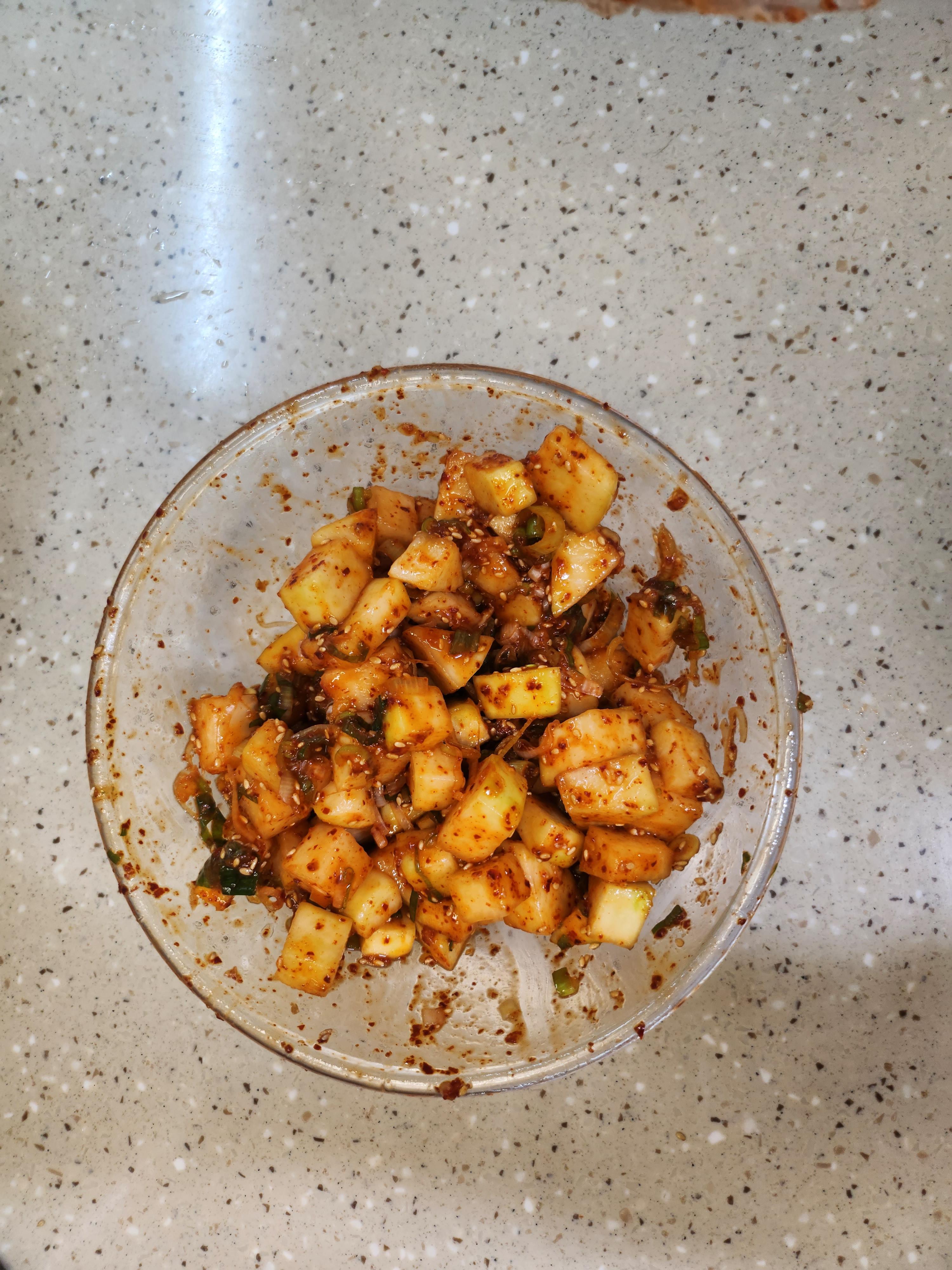 깍두기 앙념 : 고춧가루 3큰술, 액젓1큰술, 설탕1큰술, 매실청1큰술, 마늘1큰술, 깨 1큰술