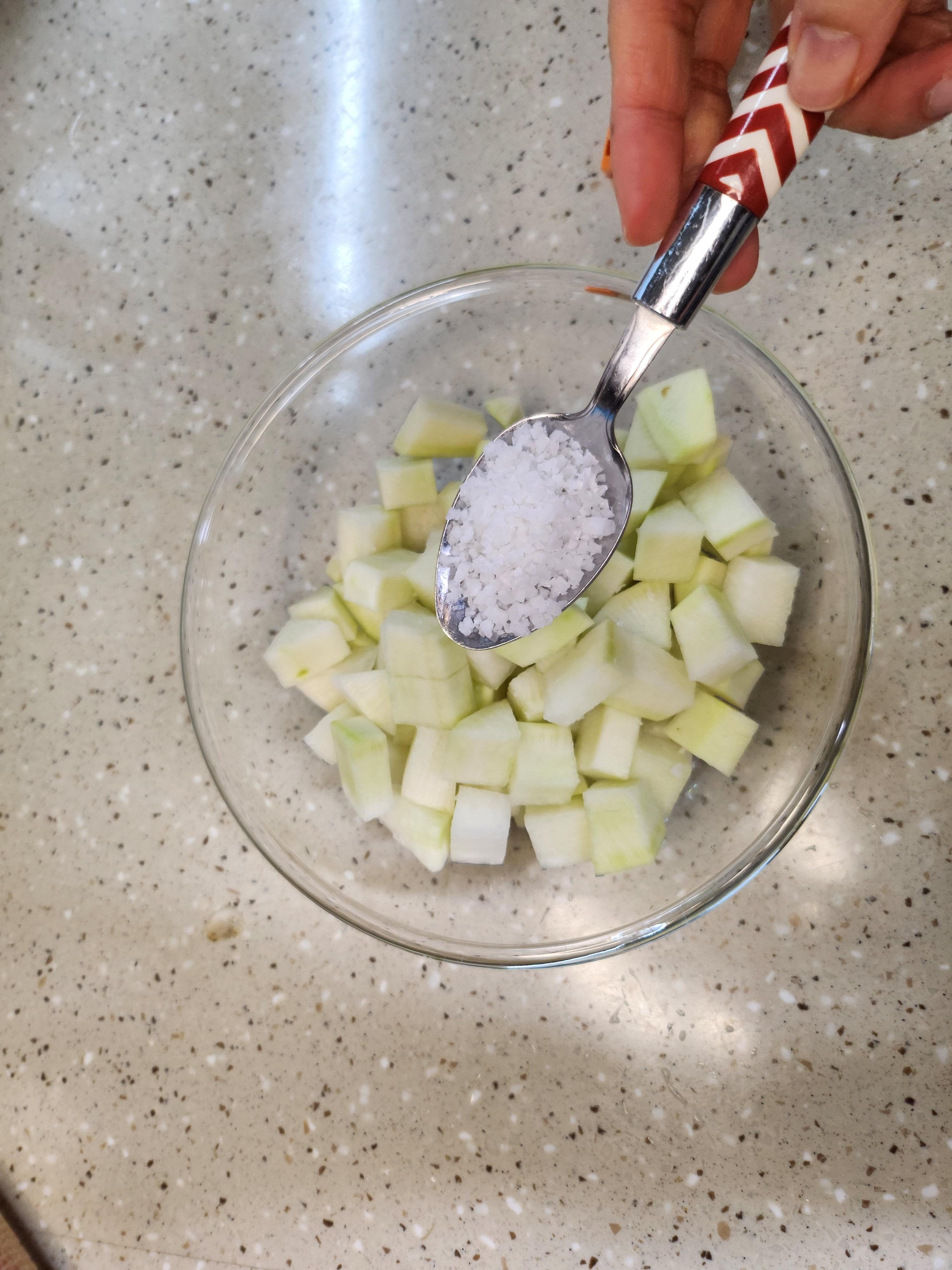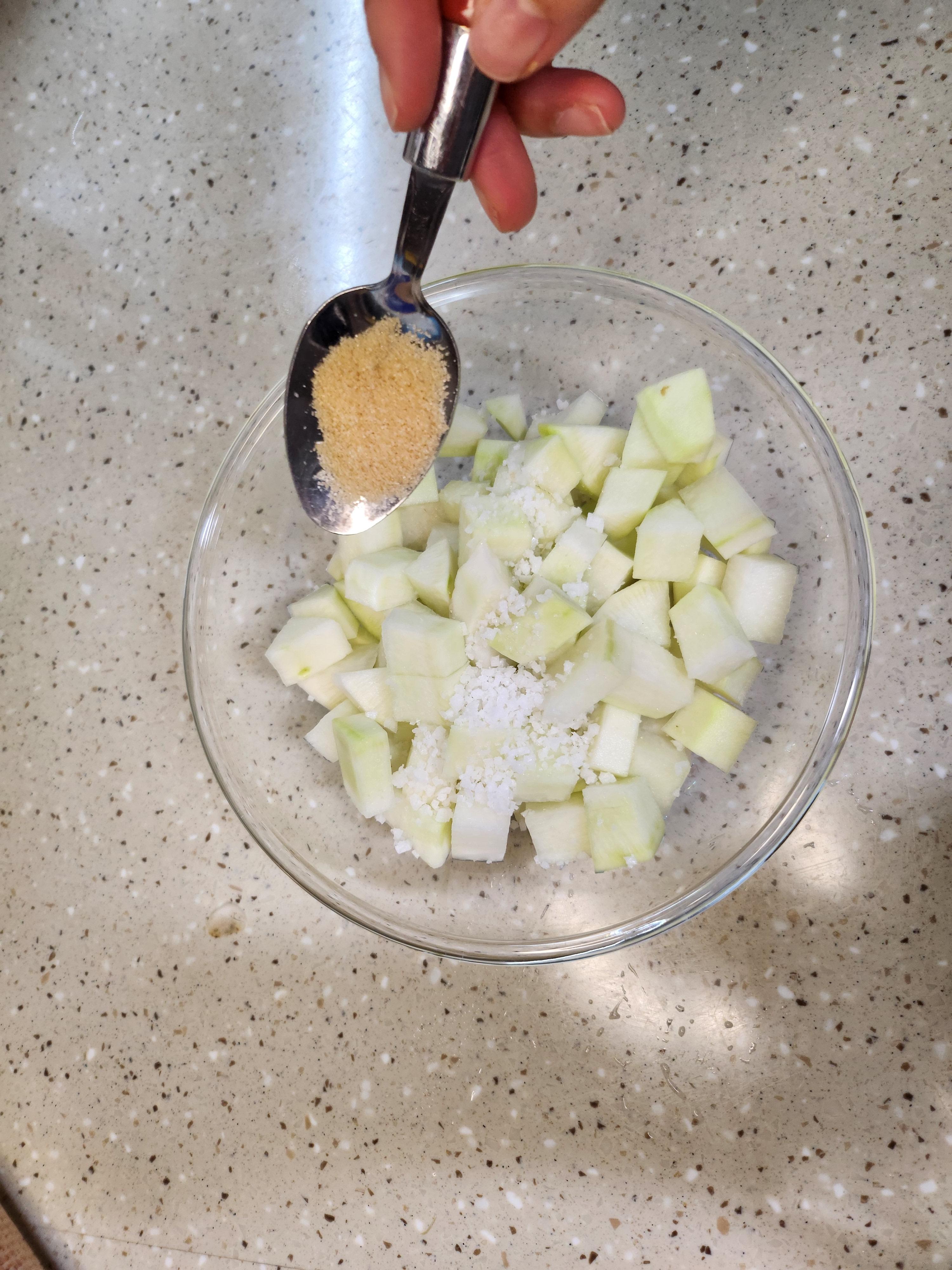 ② 자른 무를 소금 1큰술, 설탕 1큰술을 넣고 30분간 절여줍니다.