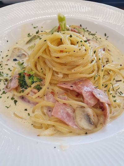 그리고 까르보나라 파스타. 적당한 양에 면발이 쫄깃해서 맛있었습니다.