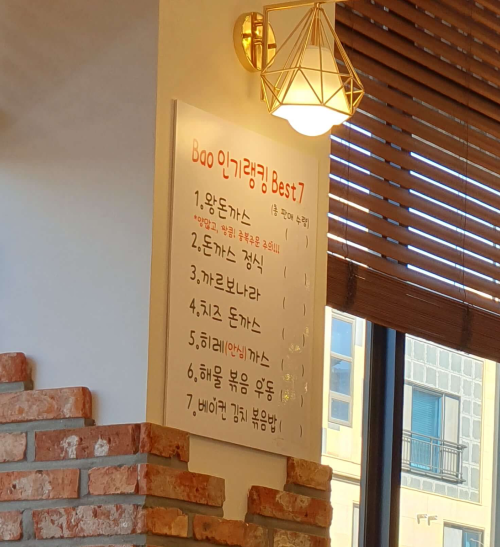 가게에 붙여있던 Best 순위인데요, 저는 왕돈까스와 까르보나라를 주문했습니다. 왕돈까스에 양 많고 짱큼, 중복 주문 주의라는 문구가 인상적인데요 얼마나 크길래 그런지... 음식을 받아보니 이해가 되었습니다.