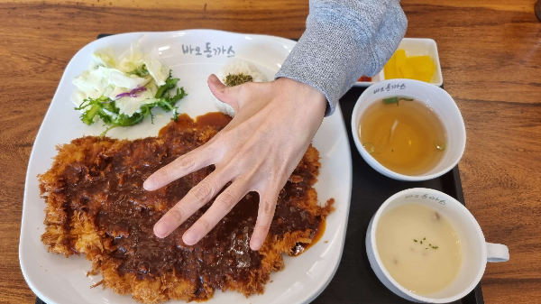 작지 않은 제 손을 쫙펴도 돈까스 면적이 훨씬 넓습니다. 이래서 중복 주문에 주의를 주셨구나 알 수 있었어요. 여자 혼자 먹기에도 꽤 많은 양이었고 어린아이와 엄마가 둘이와서 하나 시켜 먹는 분들이 종종 보였습니다.