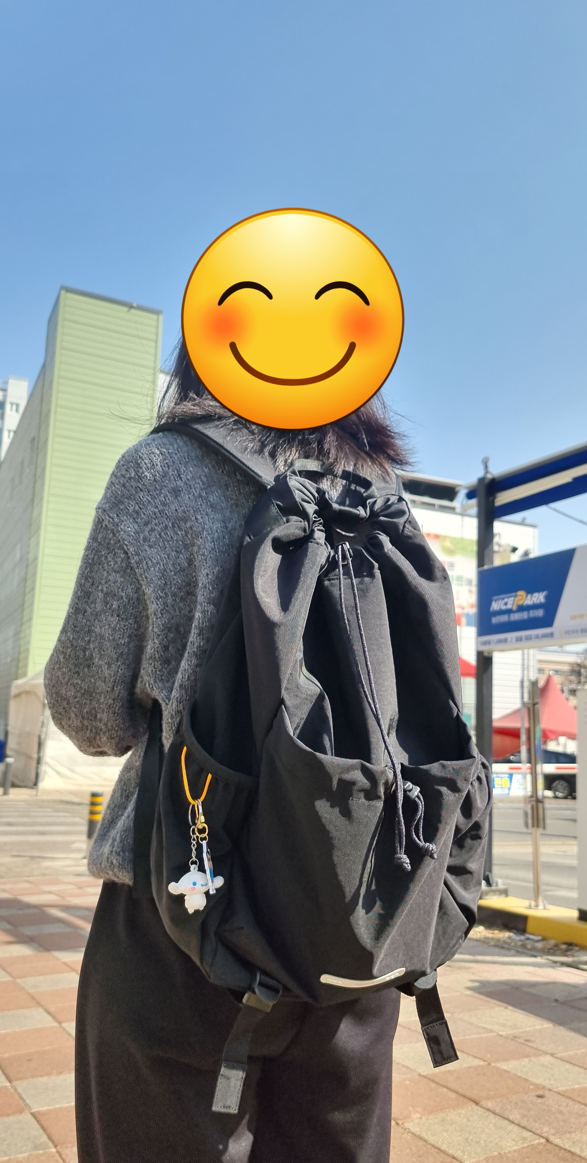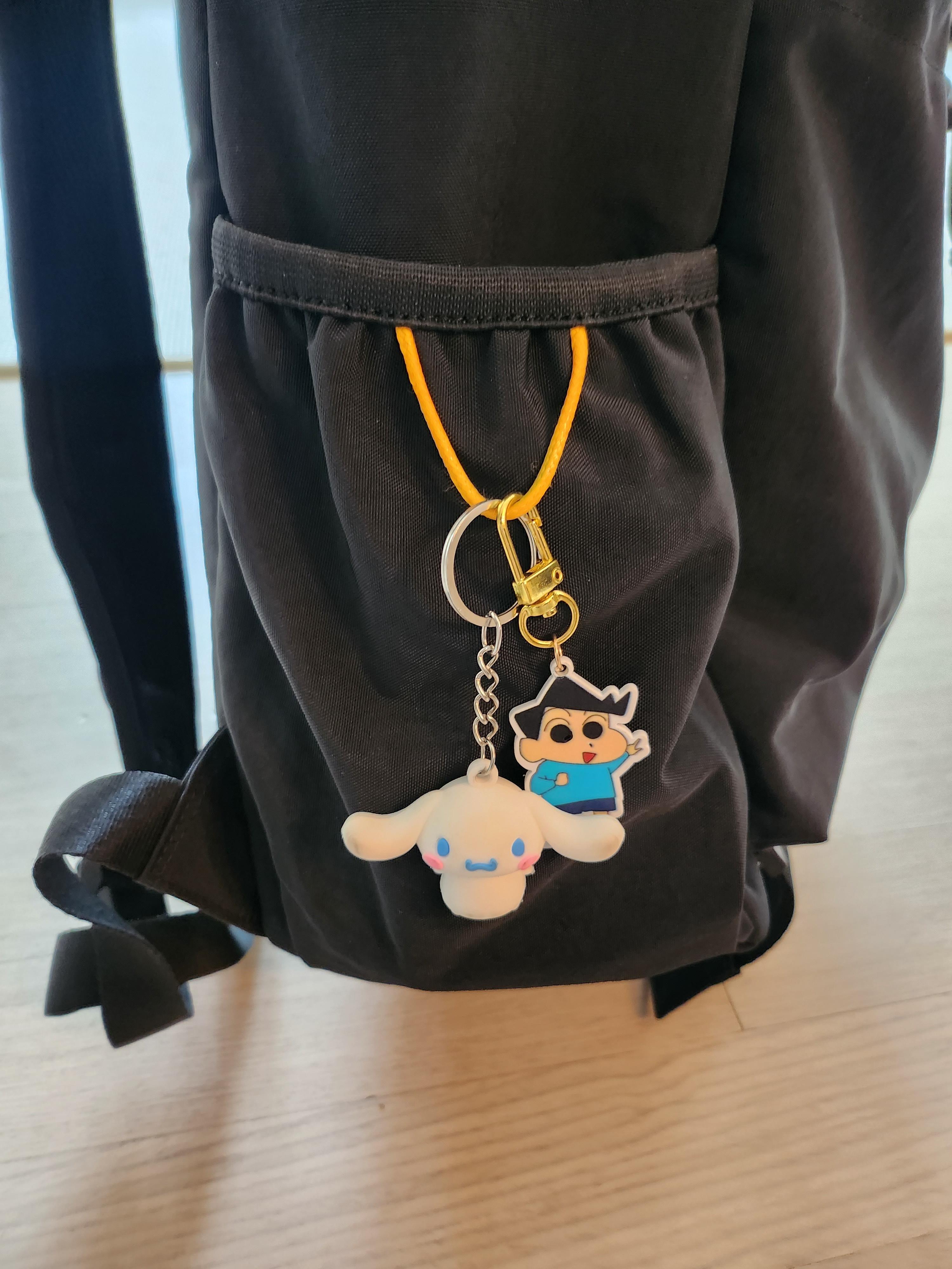 가방 옆 양쪽 포켓은 텀블러나 우산을 넣는 용도이고 저는 요즘 인기인 시나모롤과 외로울까 봐 철수도 달아주었습니다.