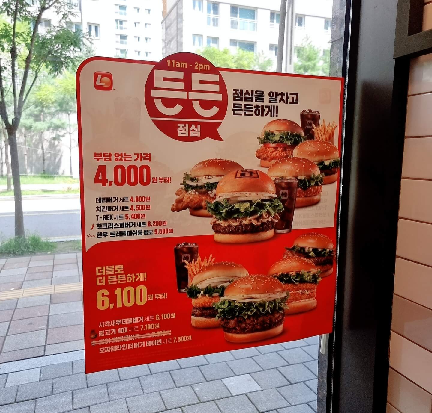 우선 든든 점심 이벤트는 오전 11시부터 오후 2시까지 데리버거 세트 4천 원, 치킨버거 세트 4,500원, T-REX 세트 5,400원, 핫크리스피버거 세트 6,200원, 한우 트러플 머쉬룸 콤보 9,500원에 진행하는 이벤트입니다.