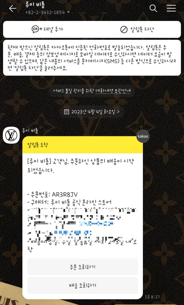 루이비통에게 카톡 받는 기분... 나쁘지 않습니다. 배송 시작부터 완료까지 배송상태에 대해 카톡이 오니 명품의 품격이 느껴졌달까? 세심한 배려가 느껴졌습니다.