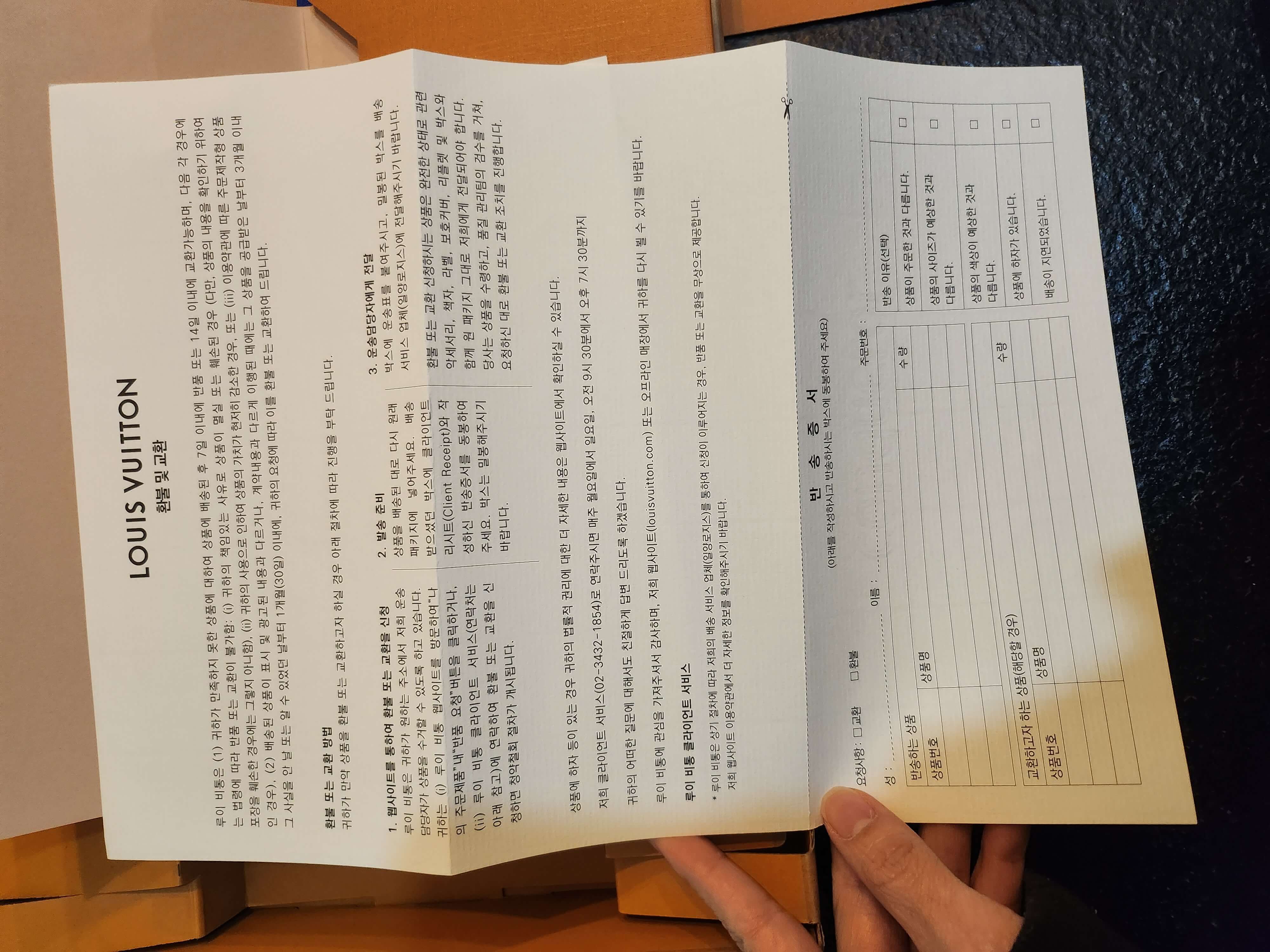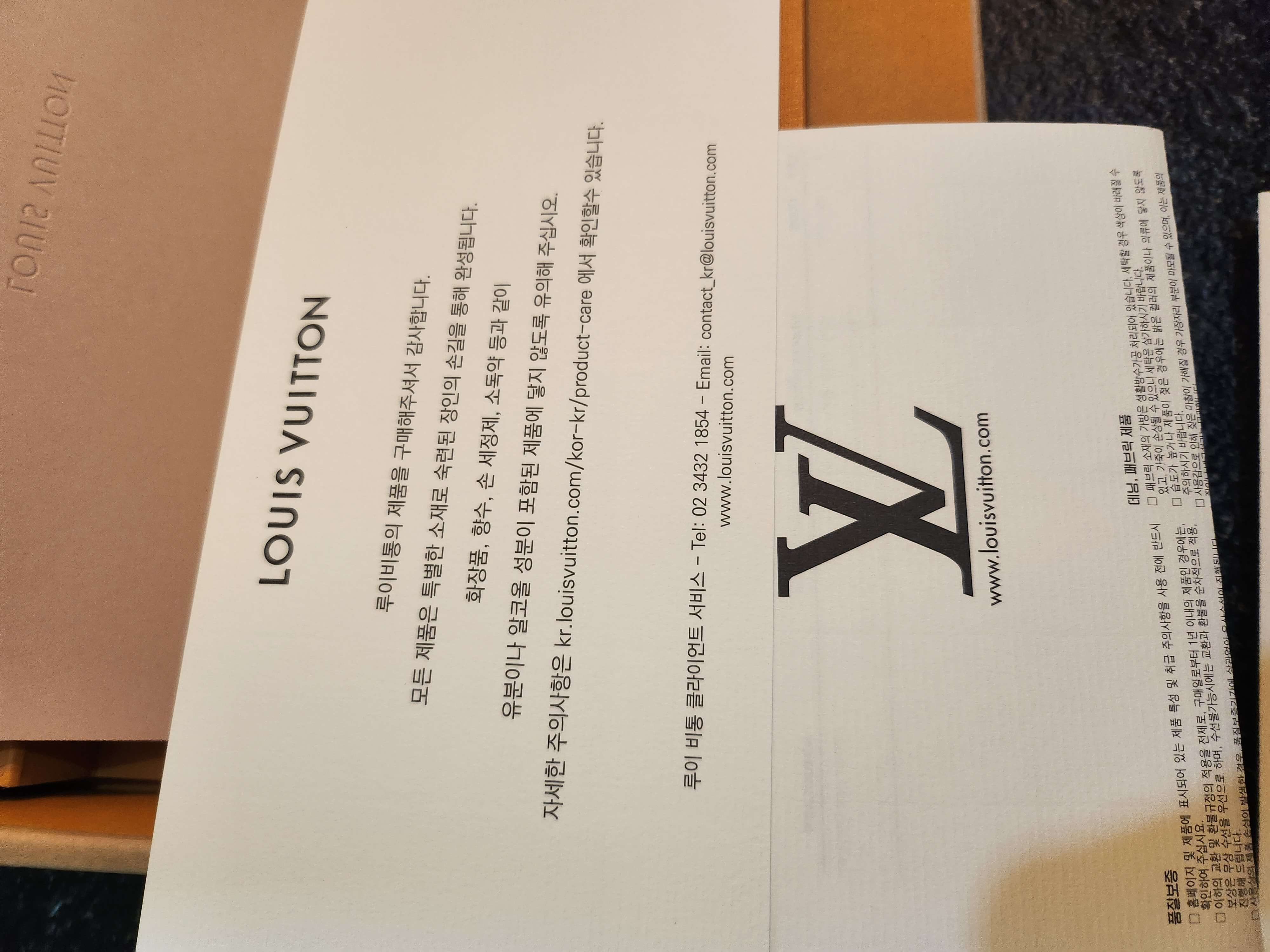 이 종이는 루이비통 제품 안내사항과 교환 신청서입니다. 제품에 문제가 있다면 이용하면 되겠죠?