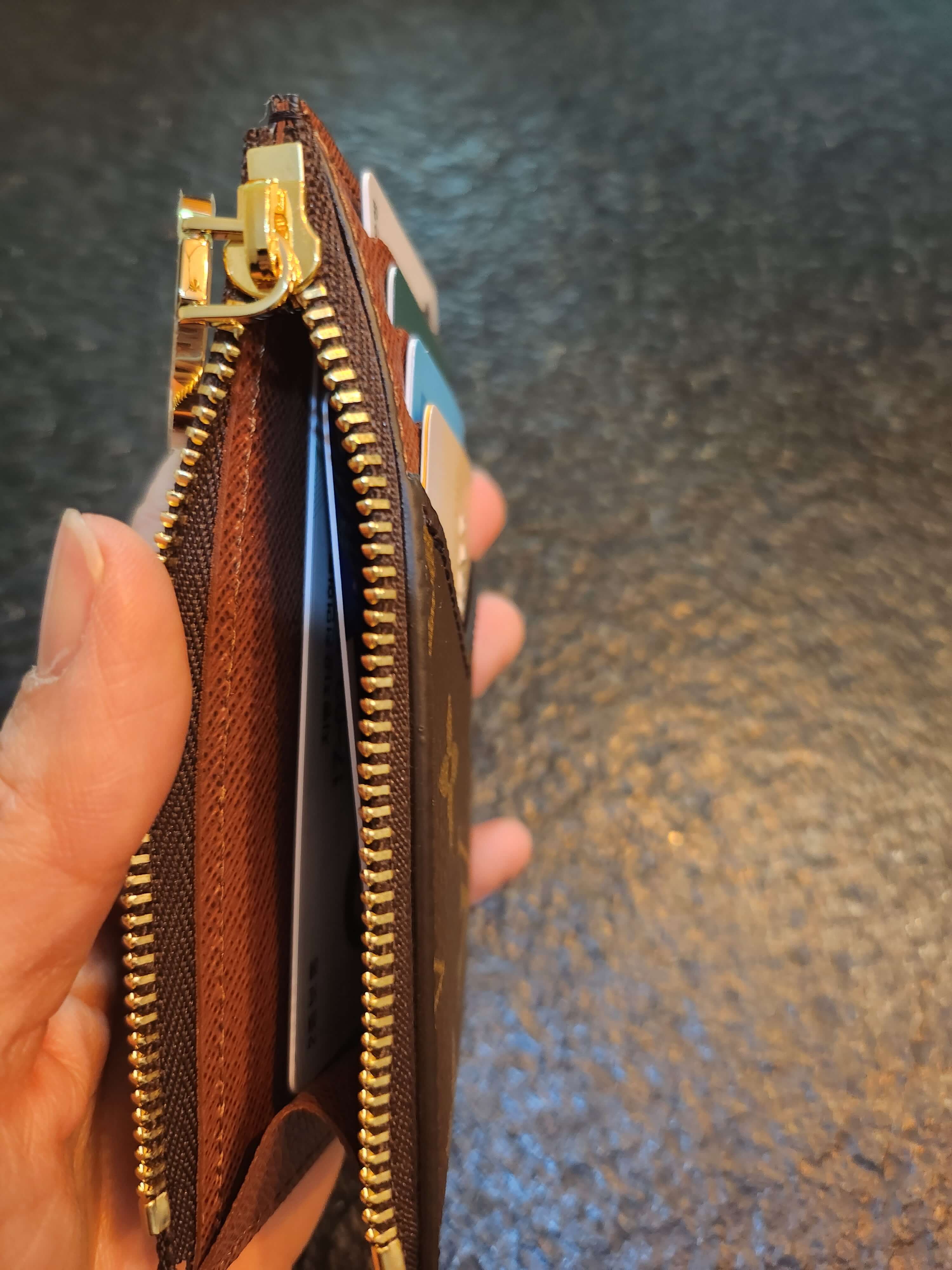바깥 쪽에 카드 4장, 지퍼 안에 카드 2장을 꽂은 모습입니다. 안쪽 지퍼에는 카드 수납을 더 할 수 있는 여유가 있는데 더 넣을 카드가 없어서 이 만큼만 넣어봤습니다. 이렇게 수납해도 뚱뚱해지지 않고 깔끔한 모양 그대로 유지됩니다.