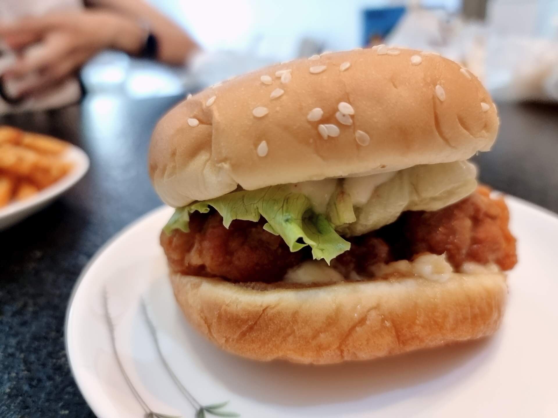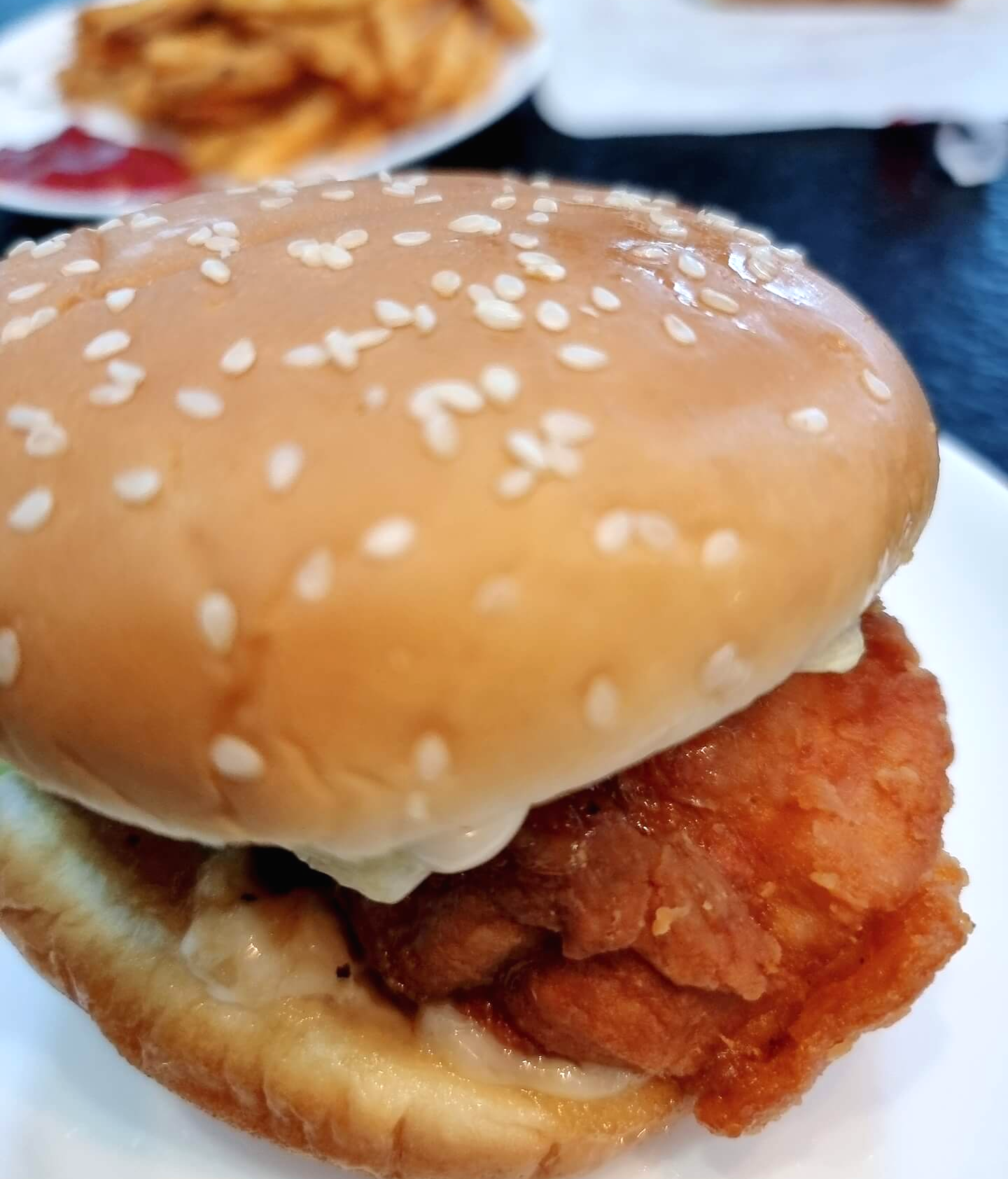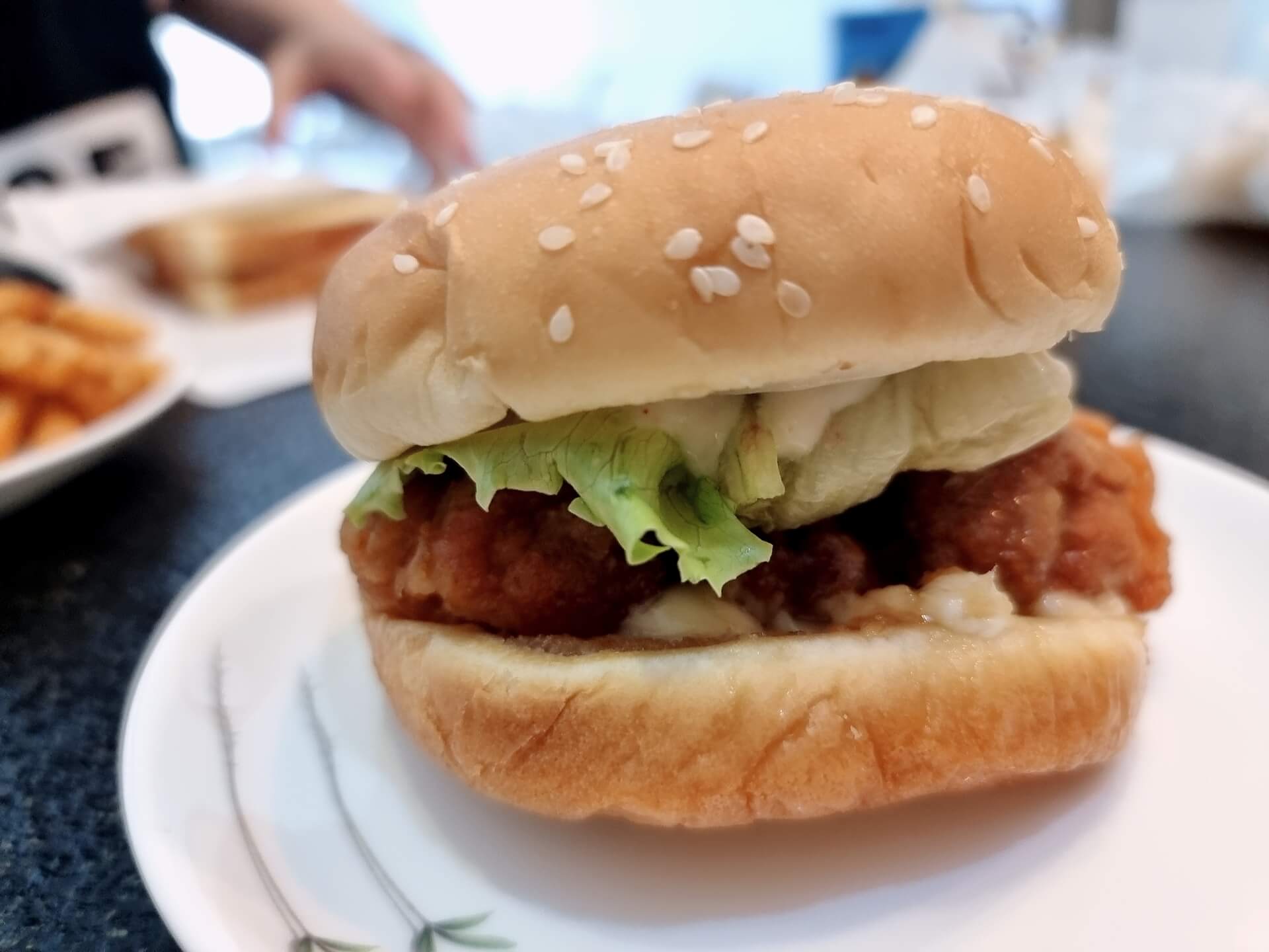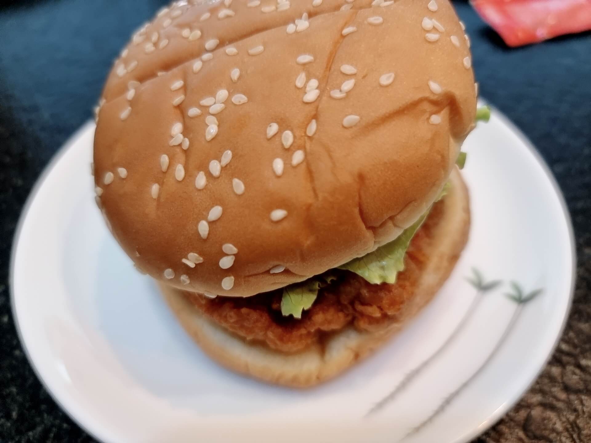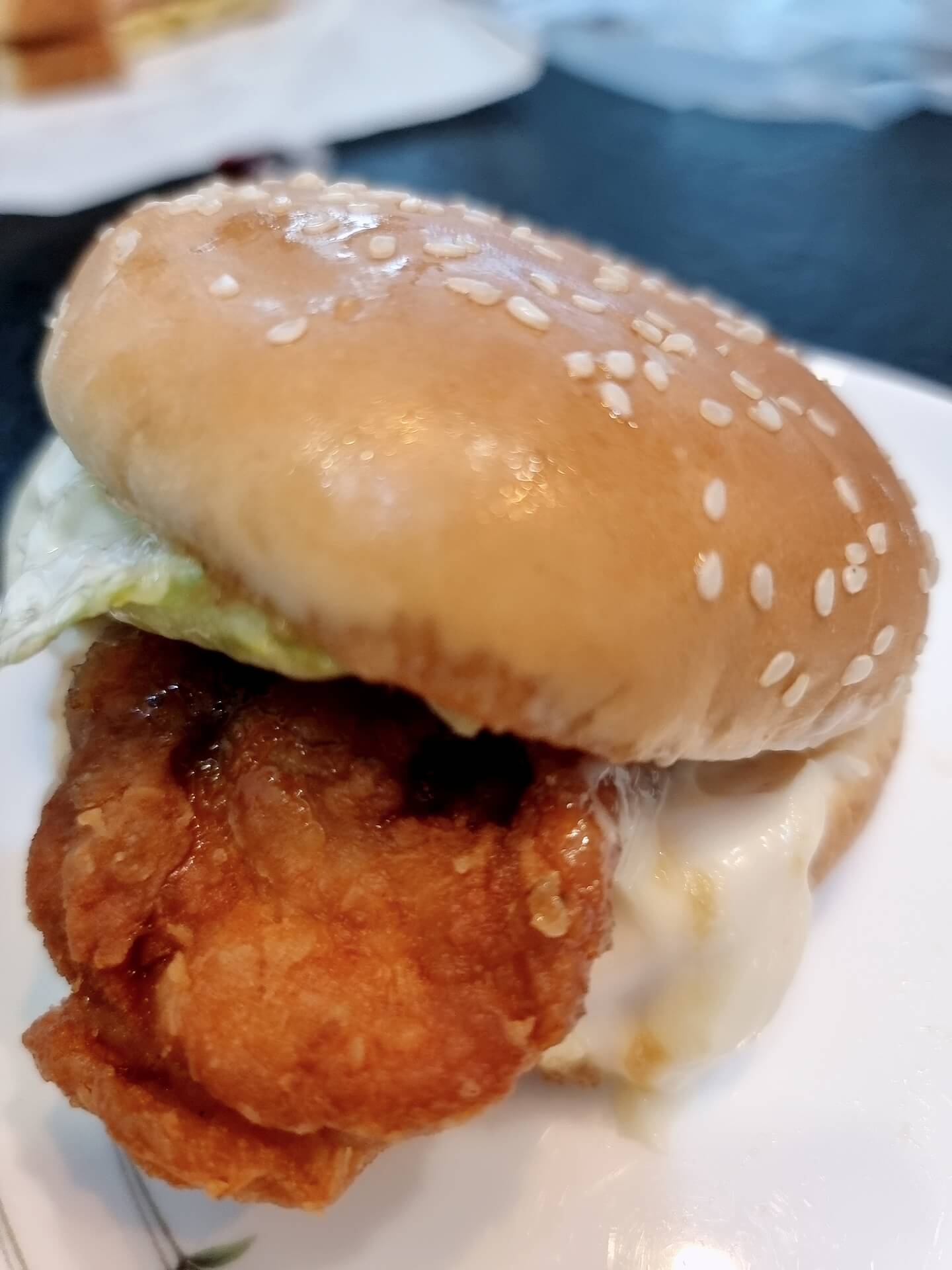 버거에 치킨 패티가 너무 커서 감출수가 없습니다.