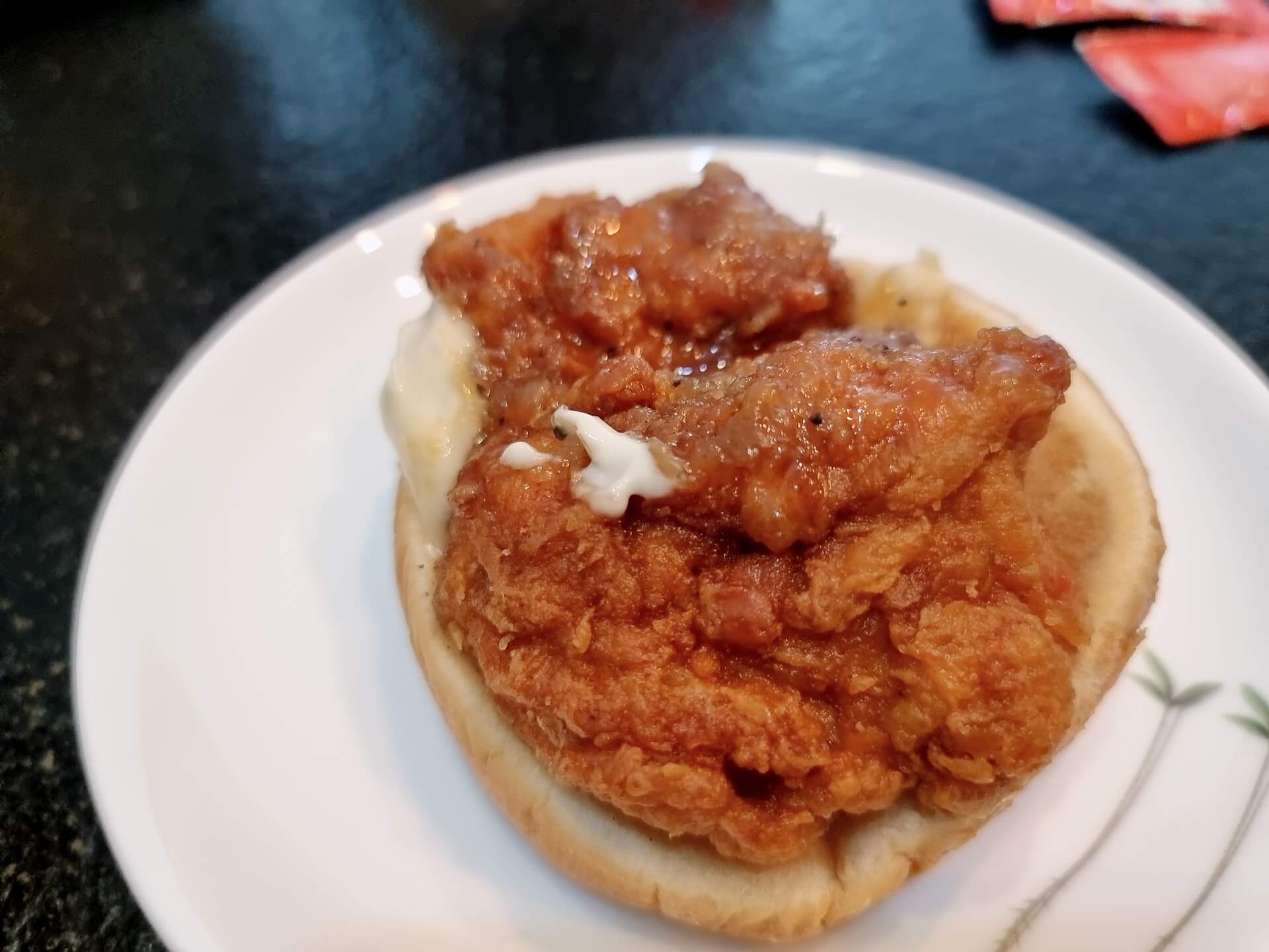한쪽으로 한입 베어 물었는데 치킨 패티에 간장 마늘 베이스와 소스가 단짠에 환상적이 조합이었습니다.