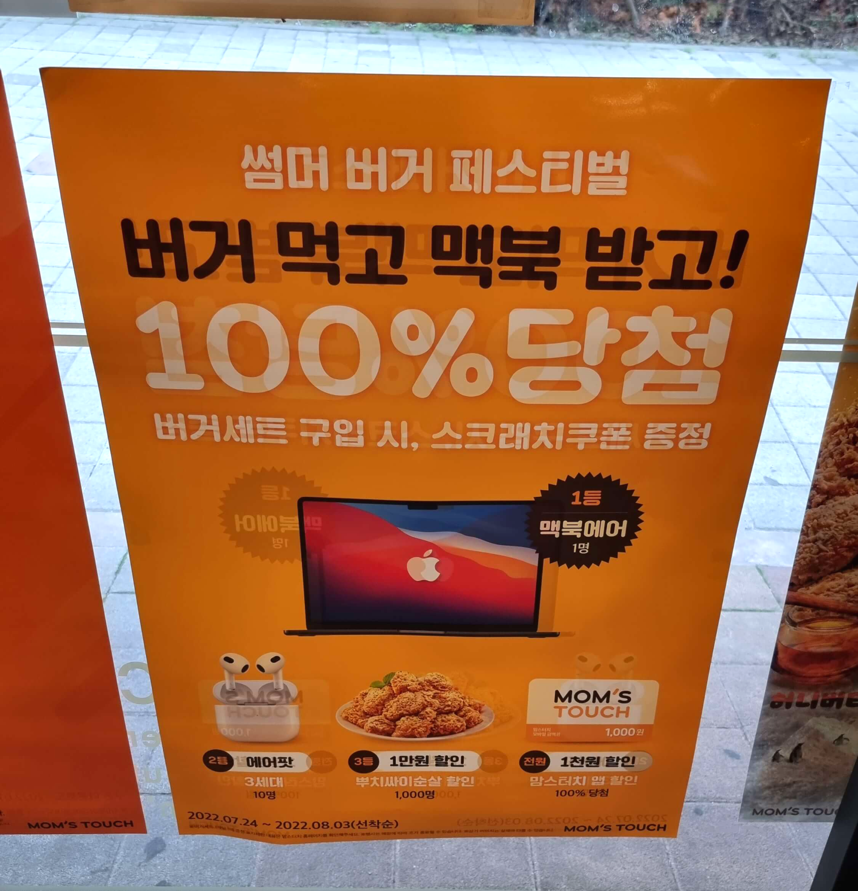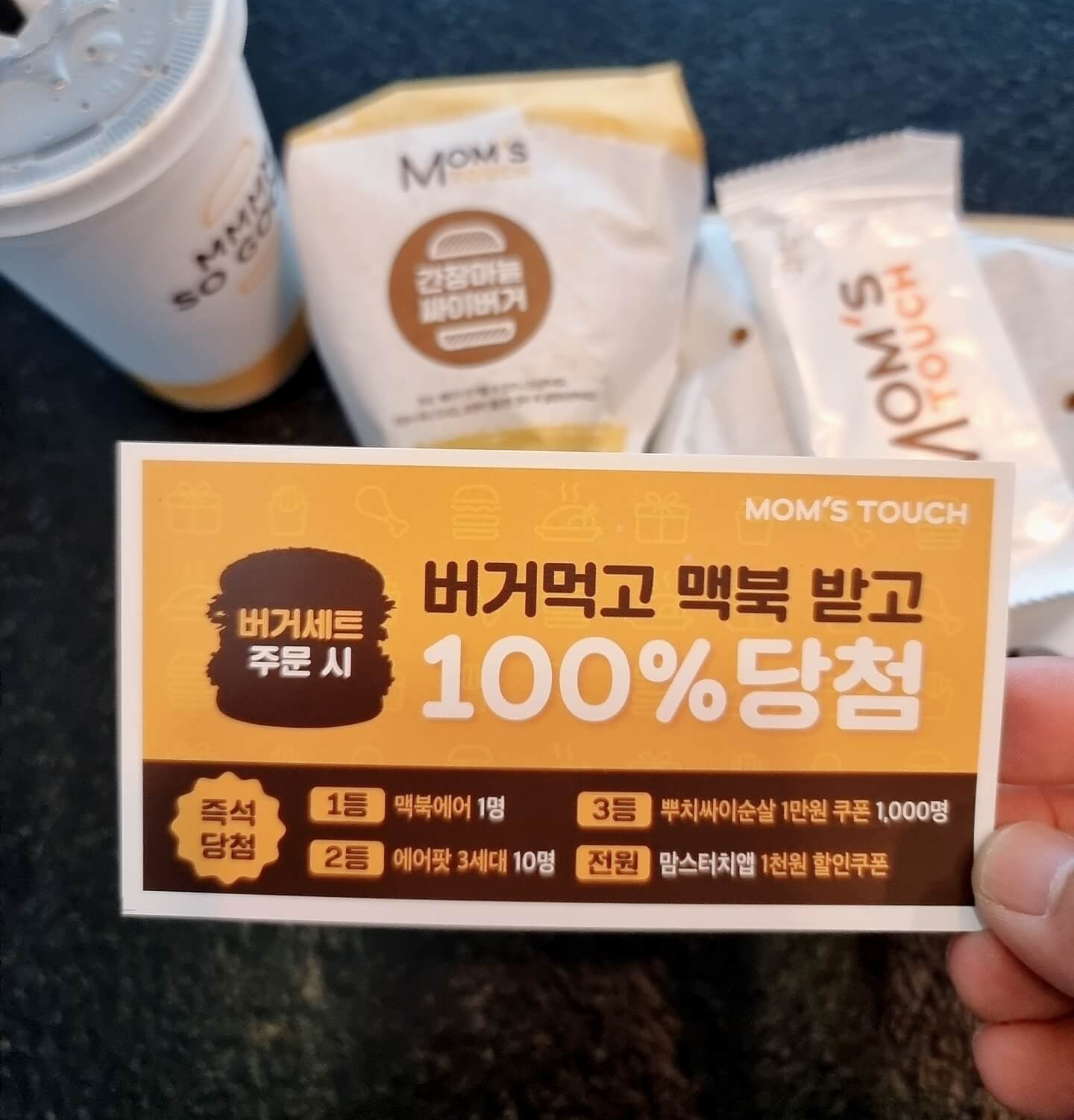 맘스터치에서 이벤트로 버거 세트를 구입하시는 분들에게 스크래치 쿠폰을 증정하고 있습니다. 이 스크래치 쿠폰 1등이 바로 맥북에어입니다.