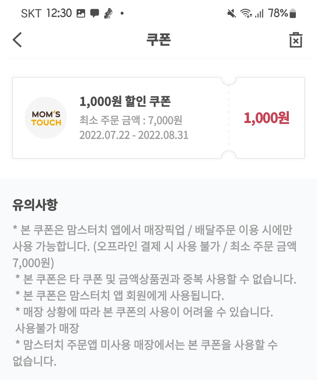 쿠폰은 맘스터치 앱을 이용해 주문 결제해야 합니다. 매장에서 쿠폰을 제시하고 구입할 수 없고, 최소 주문 금액은 7천원입니다. 100% 당첨이지만 천 원 할인 다시 사용할지는 잘 모르겠습니다.