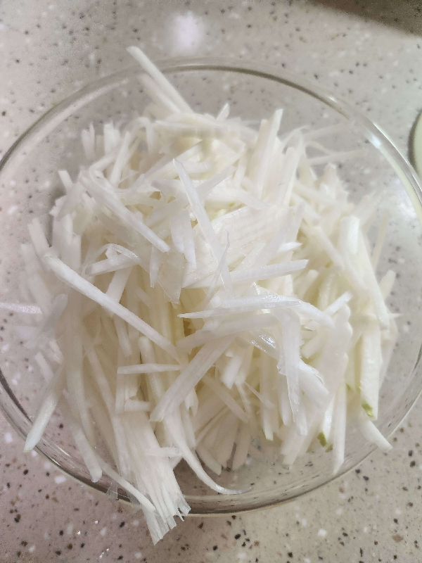 (일정하게 가늘게 썬 무는 양념이 잘 스며든다. 채칼이 있다면 사용하는 것이 좋다.)