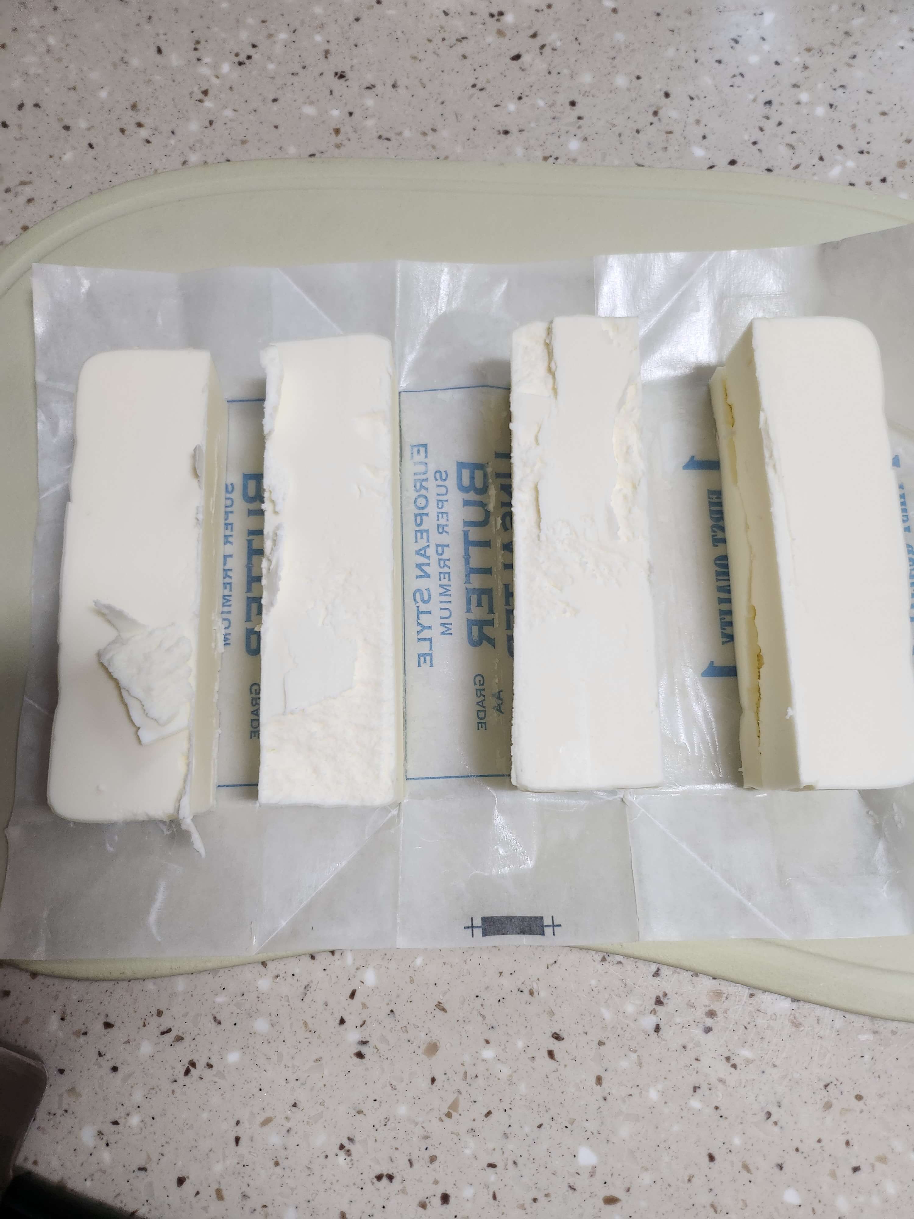 한 덩이의 버터가 두 개로 갈라지고, 2개의 버터는 4개로, 4개에서 16개로 깍둑썰기 해줍니다.