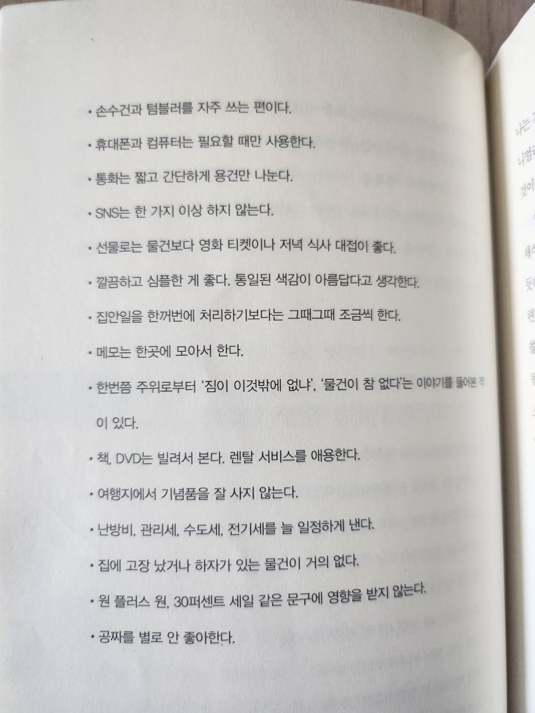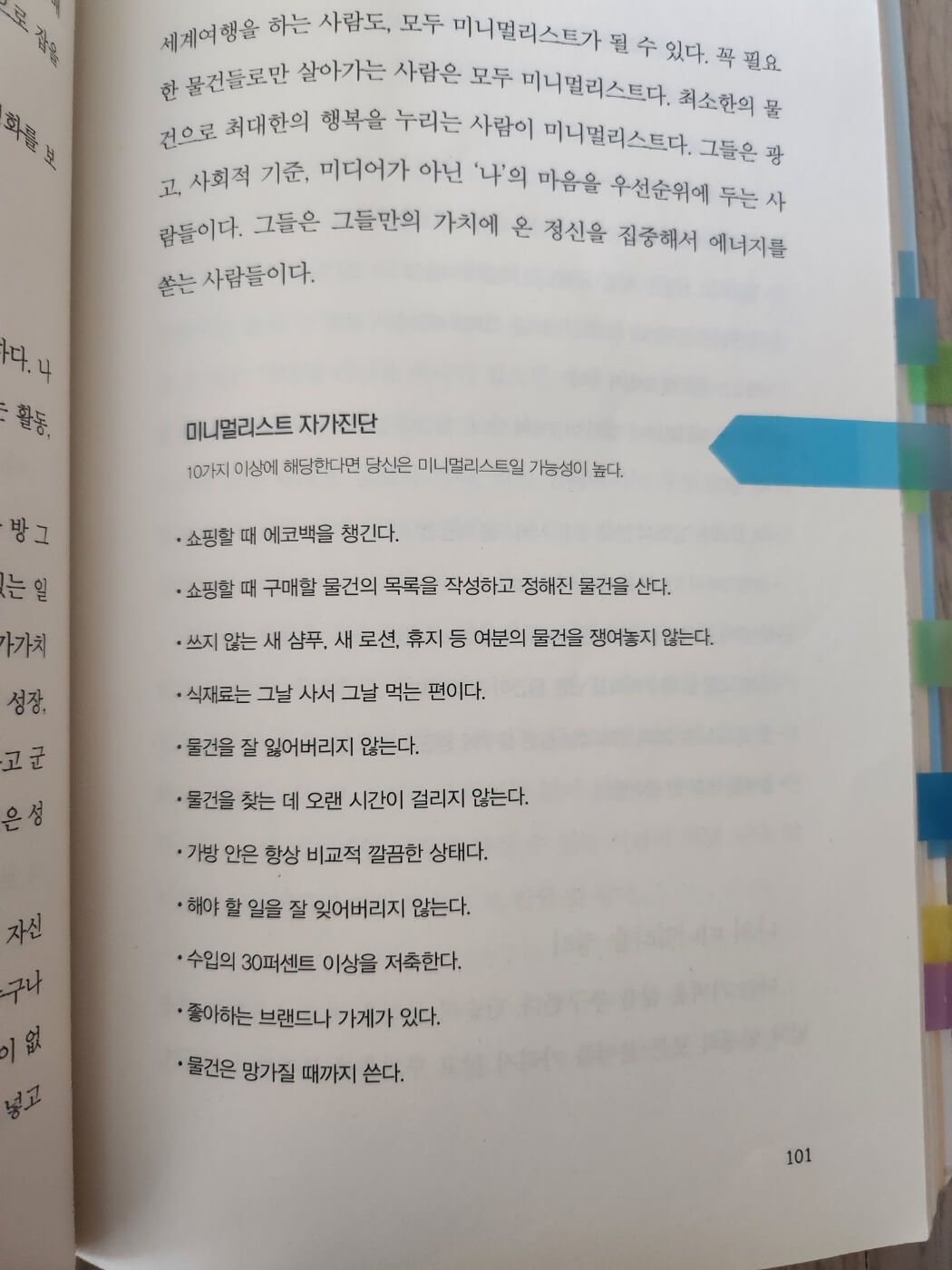 미니멀리스트 자가진단은 작가의 다른 책 「단순하게 사니, 참 좋다」에서 가져온 일부분이다. 이 중 10개 이상이면 미니멀리스트일 가능성이 높다고 한다. 난 15개가 해당되었는데 미니멀리스트가 되고 싶지만 아직 갈 길이 먼 초보이다.