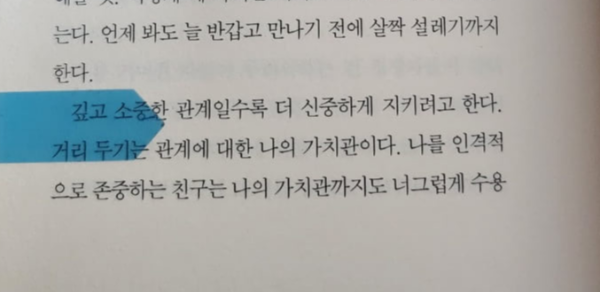 미니멀 라이프는 물건 구입에만 그치지 않는다. 관계에도 미니멀이 필요하다. 서로에게 상처를 주는 관계임에도 끊지 못해 계속 상처를 주며 만나는 관계도 주변에서 찾아볼 수 있다. 미니멀 라이프는 소중한 것에 가치를 두고 그 가치를 더 가꾸어 나가는 삶의 방식인 듯하다. 관계도 일정 부분 거리 두는것이 좋다. 궁극적으로 서로를 더 소중히 아끼며 대할 수 있기 때문이다.
