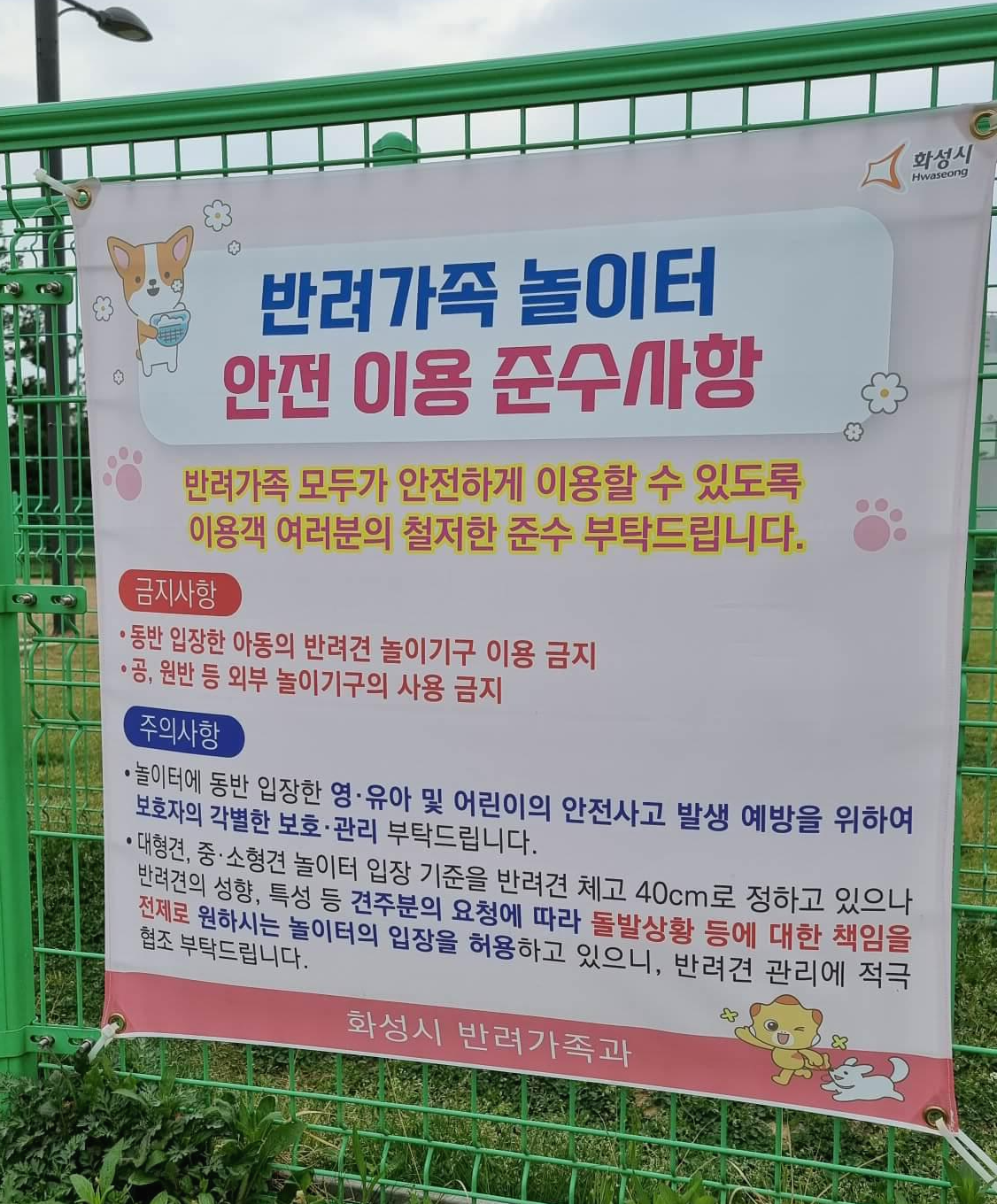 화성시에서 운영하는 공간으로 깨끗하고 잘 관리되어 있는 여울공원 반려견 놀이터는 강아지 등록만 되어 있다면 무료로 이용할 수 있습니다.
