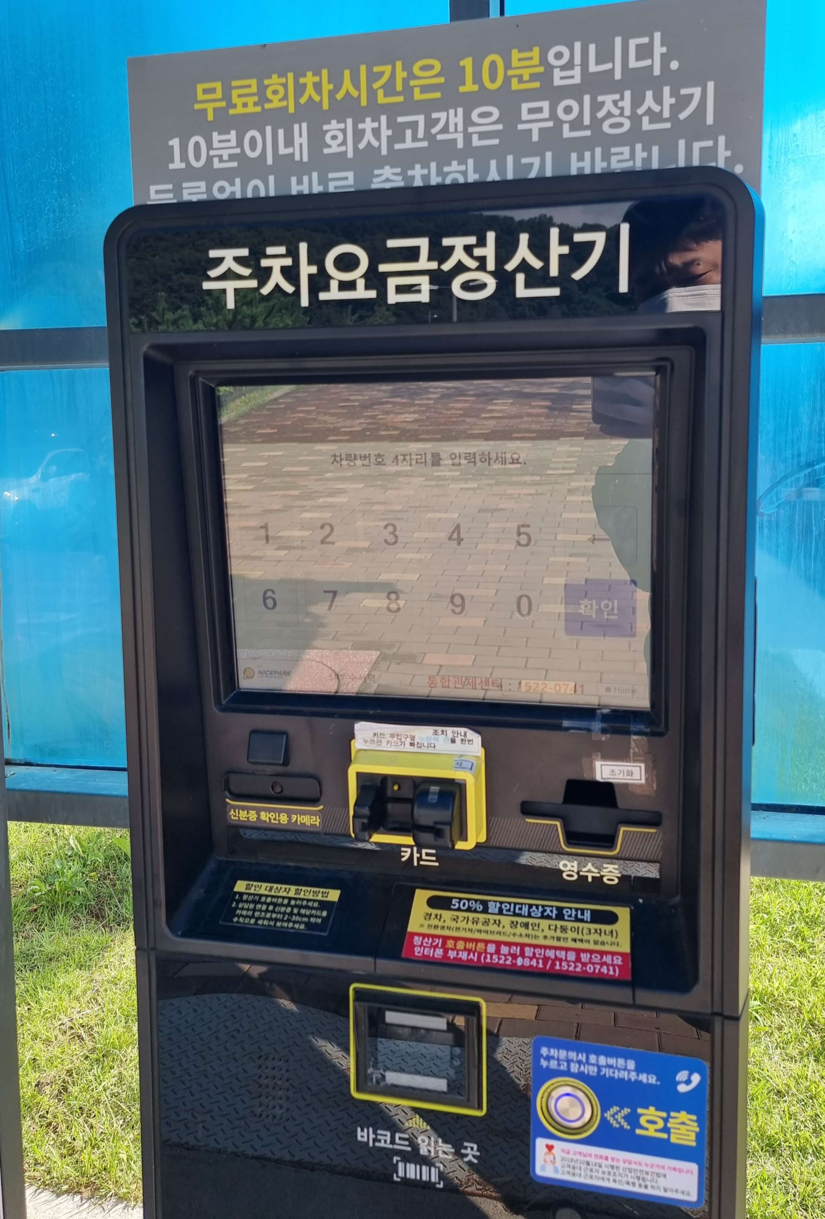 50% 할인 대상자인 경차, 국가유공자, 장애인, 다둥이(3자녀)는 주차요금정산기에서 호출 버튼을 눌러 감면 혜택을 받아야 합니다. 주차요금정산기를 통해 일반 결제를 끝낸 후에는 다시 취소하기가 어렵다고 합니다.