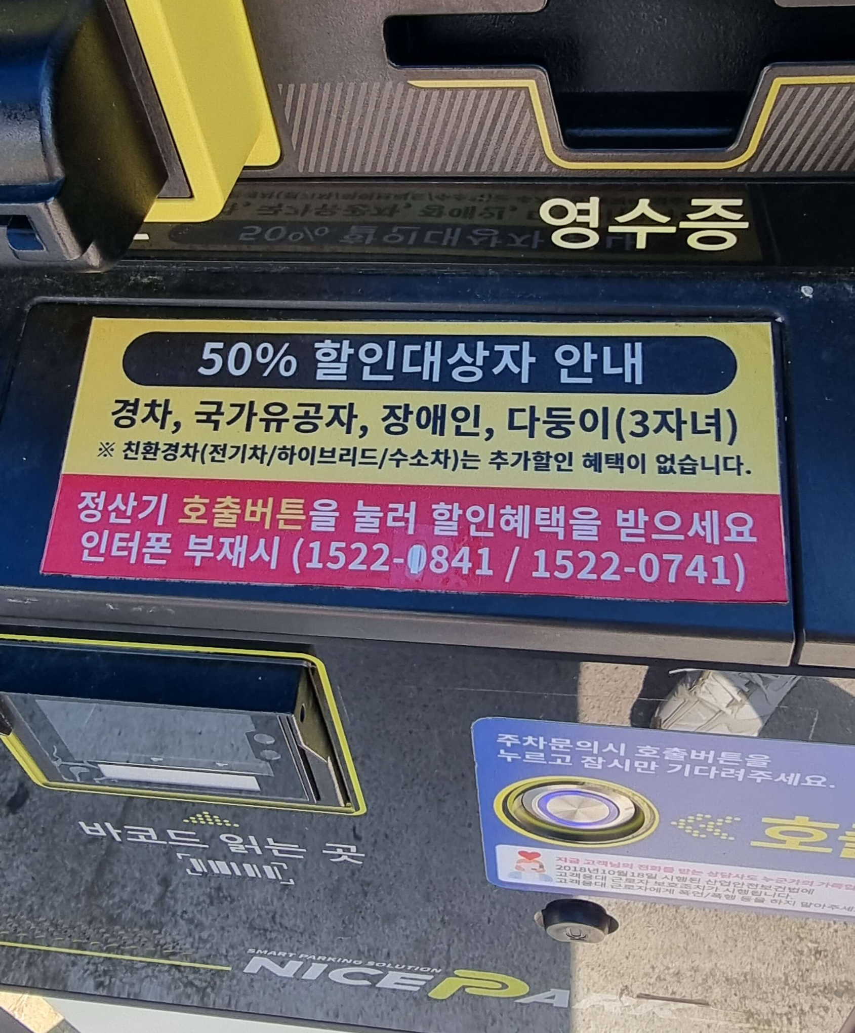 50% 할인 대상자는 꼭 정산기에 호출 버튼을 누르고 직원과 통화 후 할인을 받으시기 바랍니다.