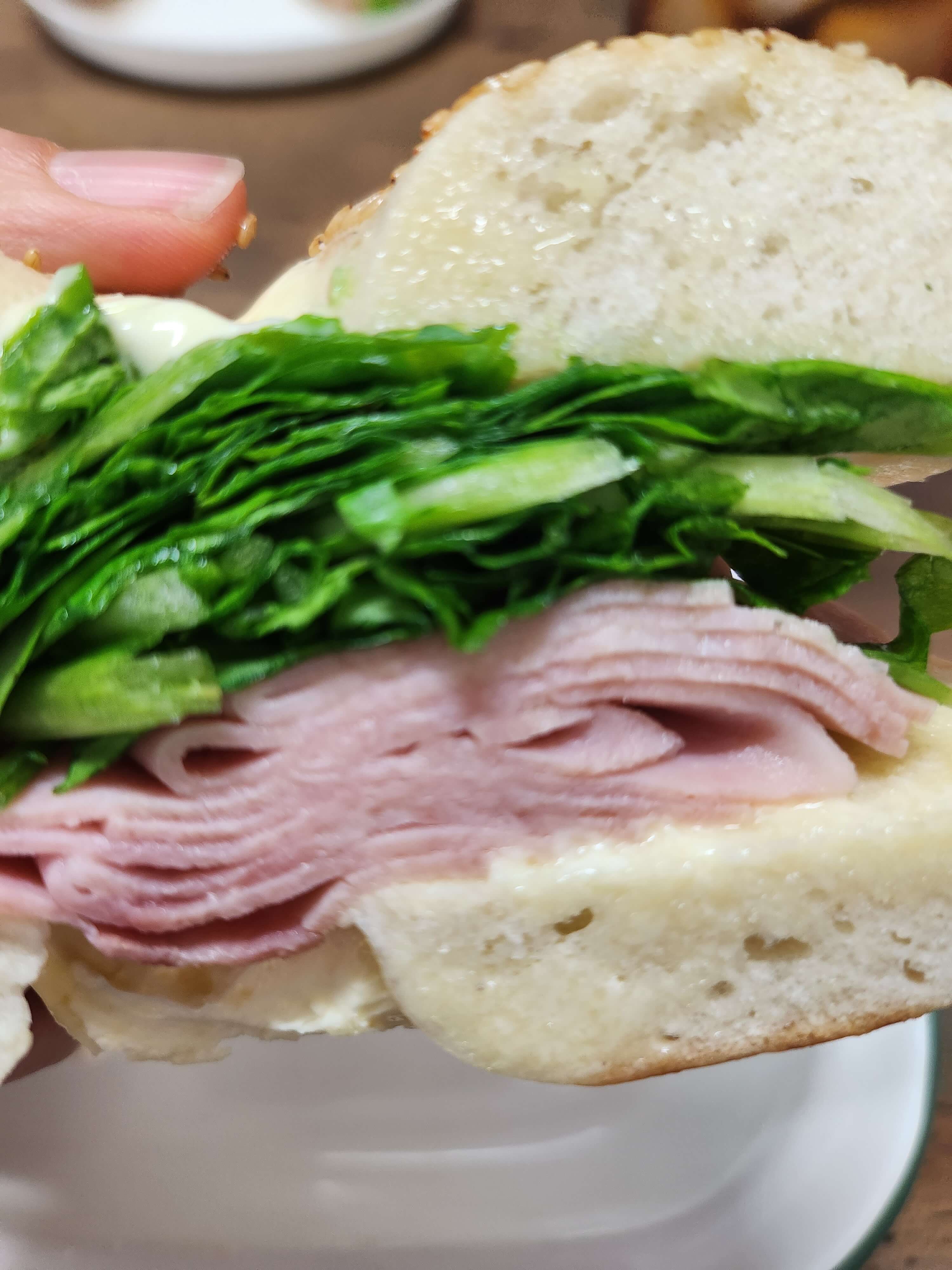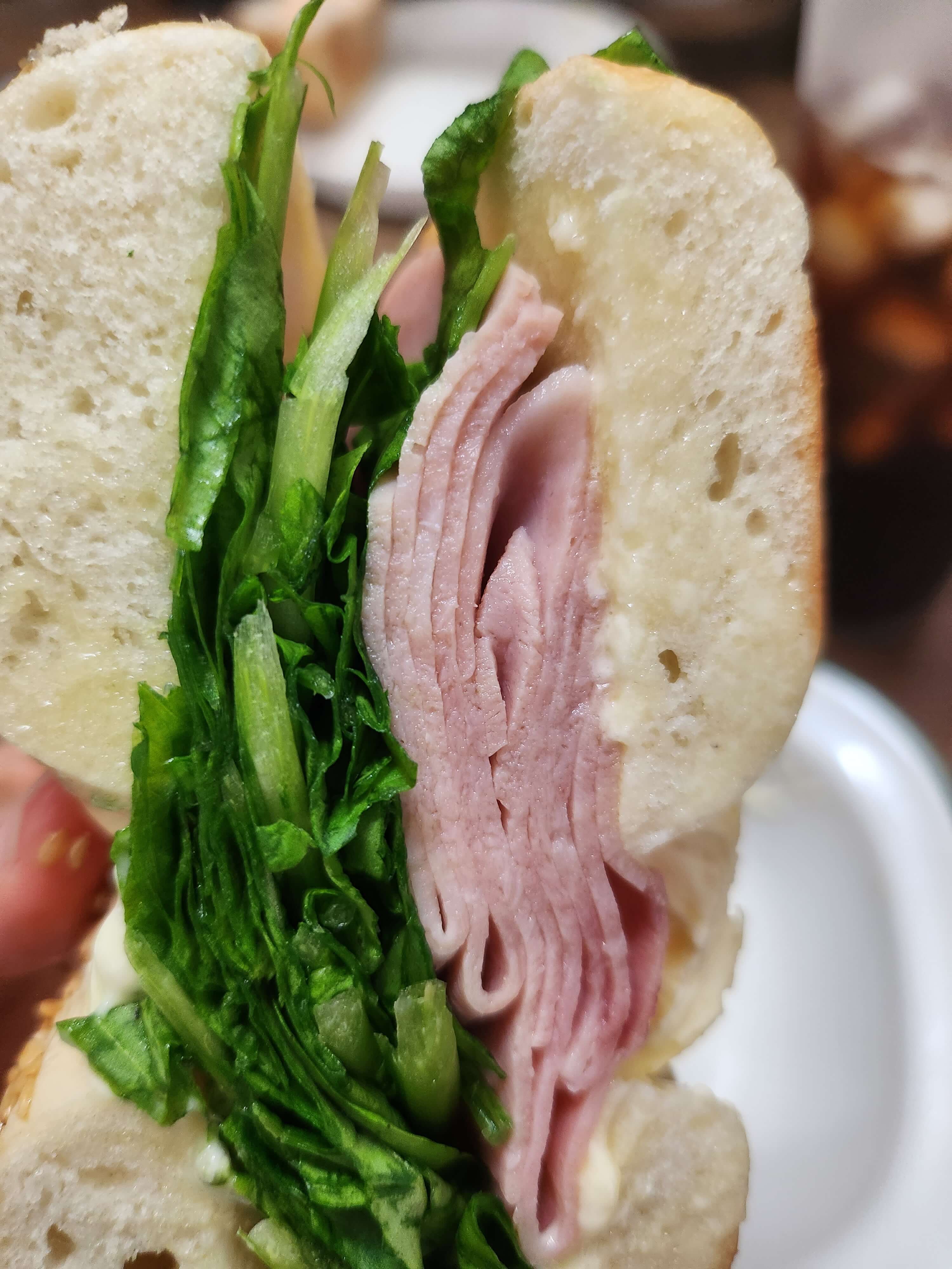 참깨가 잔뜩 올려있는 베이글 안에 루꼴라, 잠봉햄, 버터가 있어요. 그런데... 이 버터가 너무 느끼해요.
