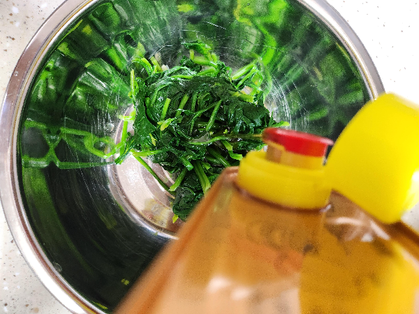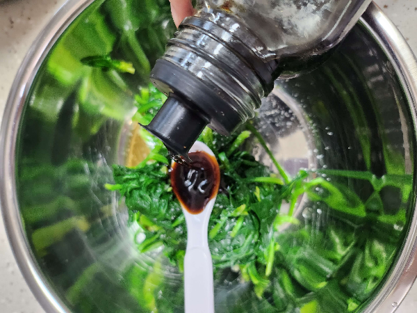 ④ 물기 짠 시금치에 다진마늘 0.5스푼, 국간장 0.5스푼, 소금 0.5 스푼, 참기름 2스푼을 넣어 조물거려 줍니다.