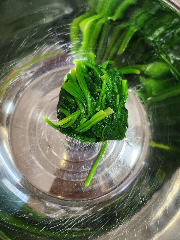 ③ 데친 시금치를 찬물에 씻고 물기를 꽈 짜줍니다.