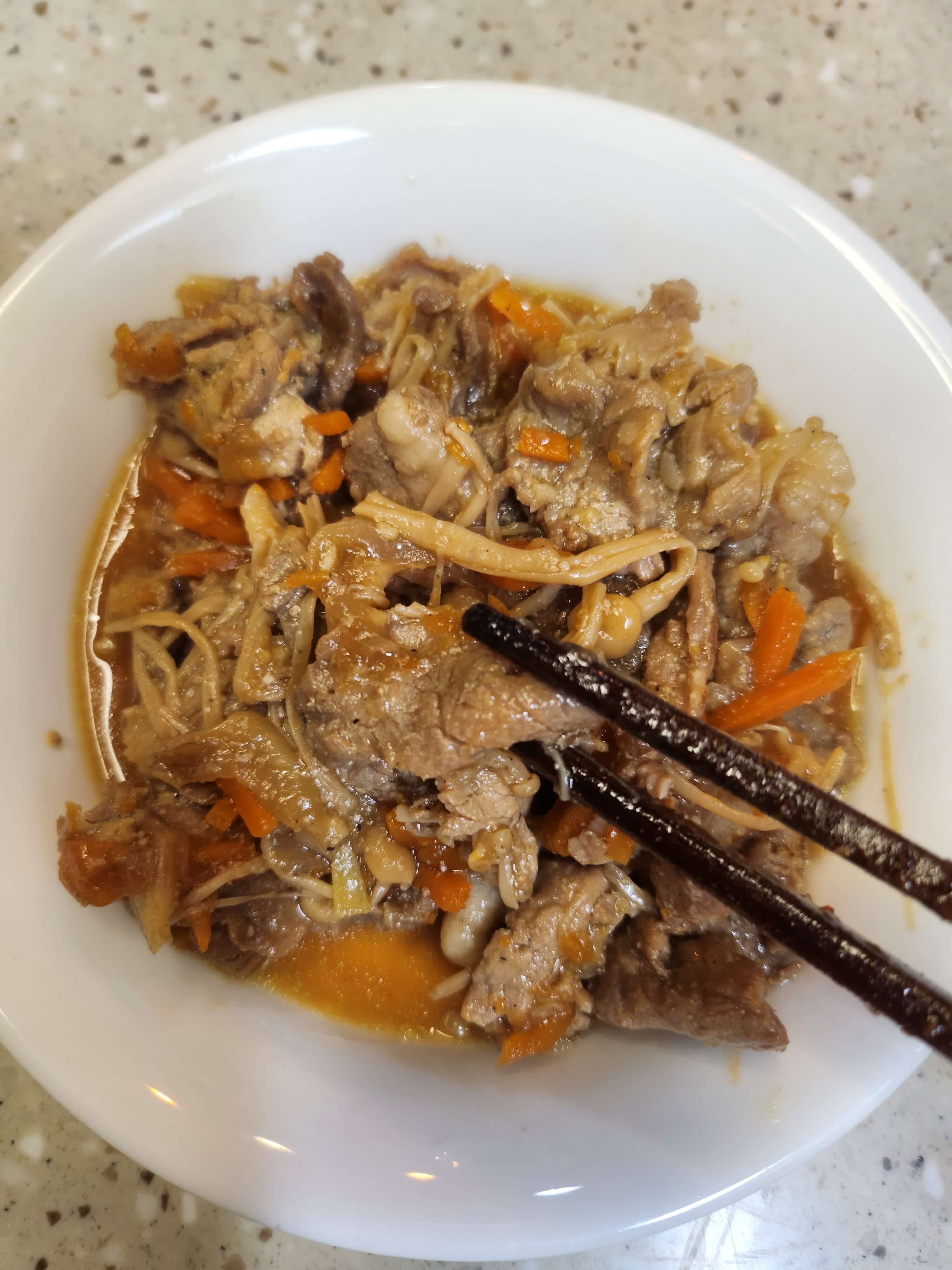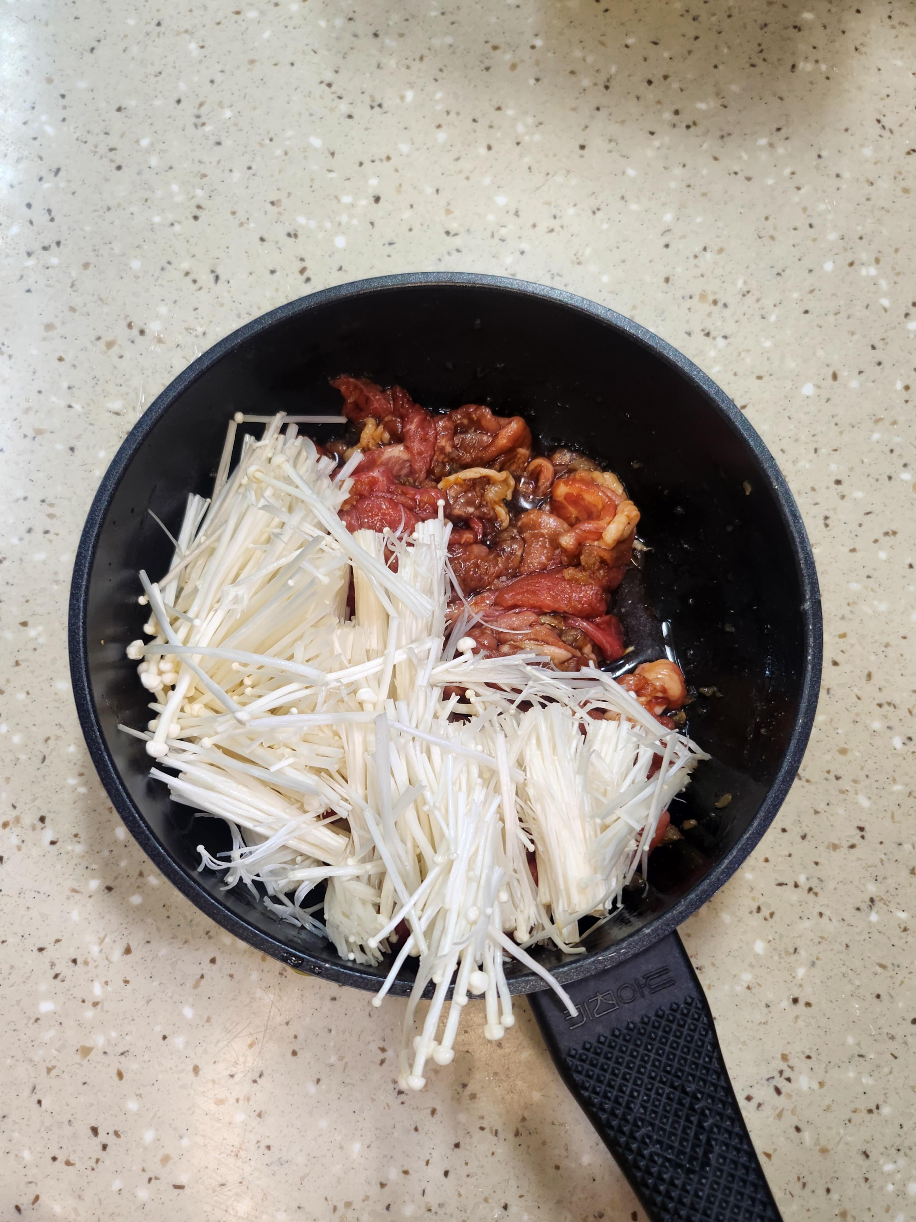 당면을 추가해서 먹고 싶은 분은 따뜻한 물에 30분 정도 미리 불린 당면을 간장제육에 넣어주세요.이때 돼지 불고기엔 물을 50cc가량 더 부어주면 됩니다.