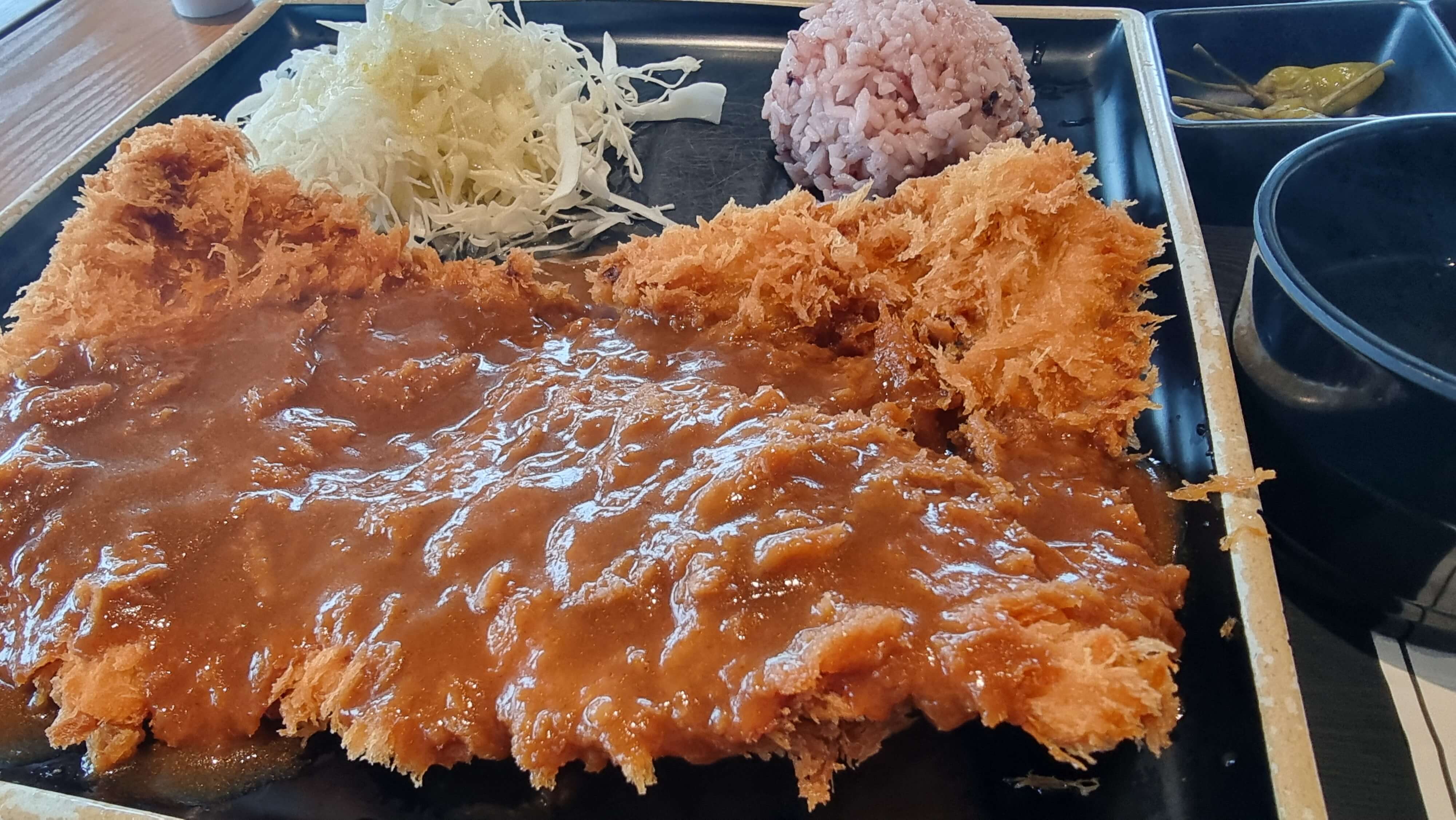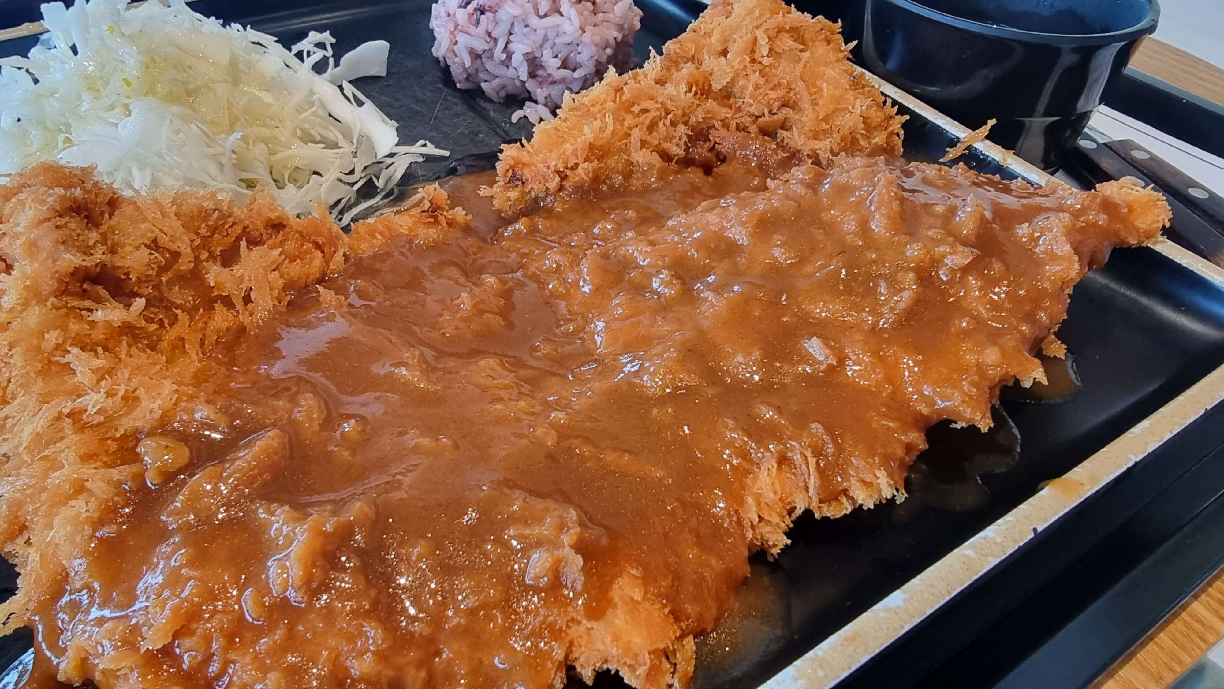 왕돈카츠는 말 그대로 왕 큰 사이즈입니다. 소스는 뿌려져 나왔고 흑미밥과 약간의 양배추 샐러드도 있어요.