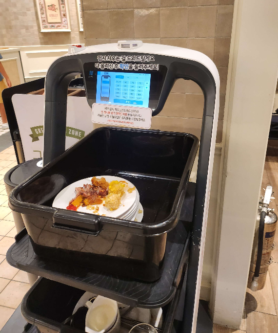 식사를 다하면 호출벨이 있는데 누르면 서빙로봇이 테이블로 옵니다. 그럼 사용한 식기를 로봇에게 주고 다시 이용하면 됩니다.