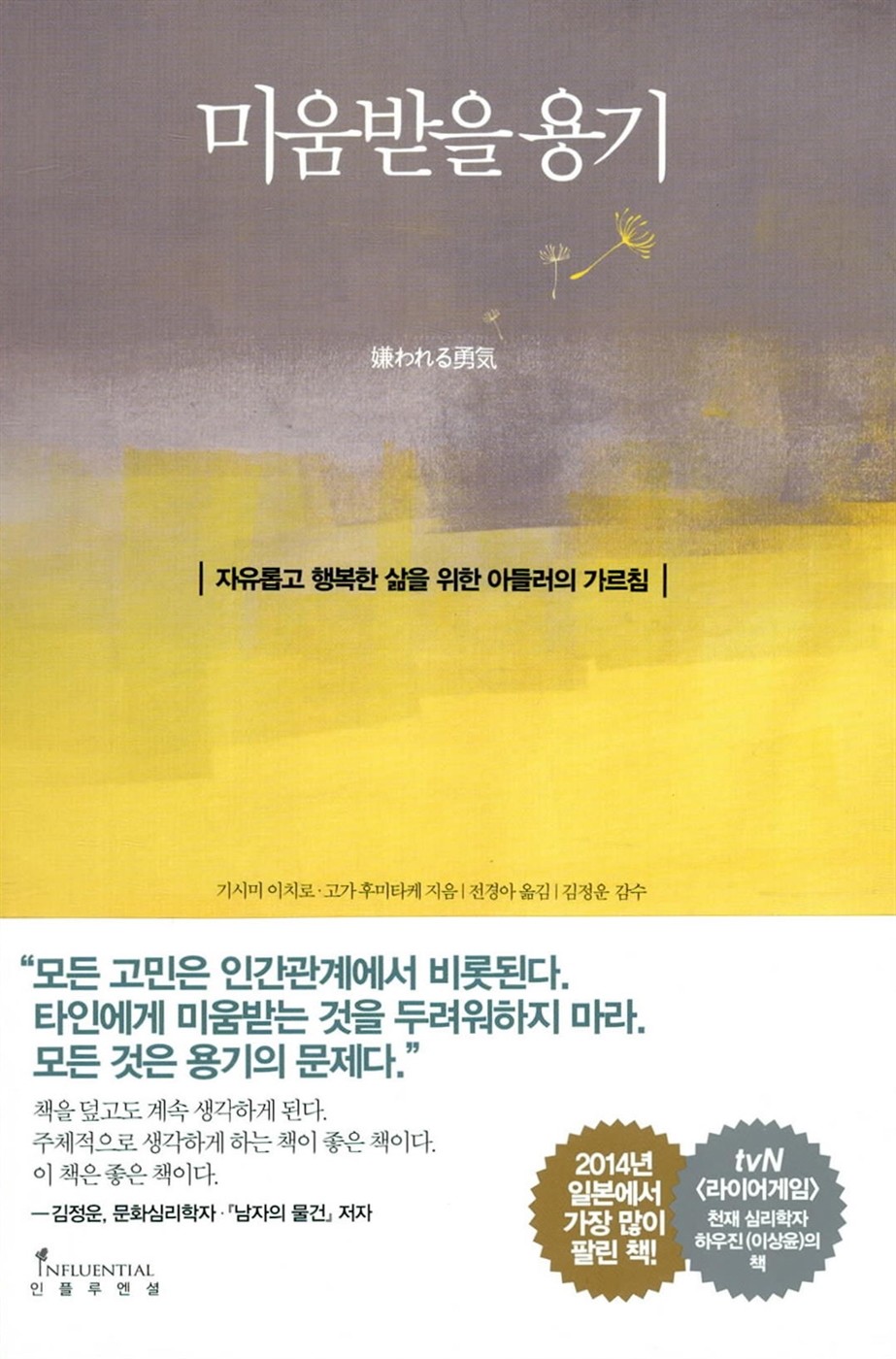 『미움받을 용기』는 아들러 심리학에 관한 일본의 1인자 철학자 기시미 이치로와 베스트셀러 작가인 고가 후미타케의 저서로, 아들러의 심리학을 ‘대화체’로 쉽고 맛깔나게 정리하고 있다. 아들러 심리학을 공부한 철학자와 세상에 부정적이고 열등감 많은 청년이 다섯 번의 만남을 통해 ‘어떻게 행복한 인생을 살 것인가’라는, 모두가 궁금해하는 질문에 답을 찾아가는 여정을 그렸다.