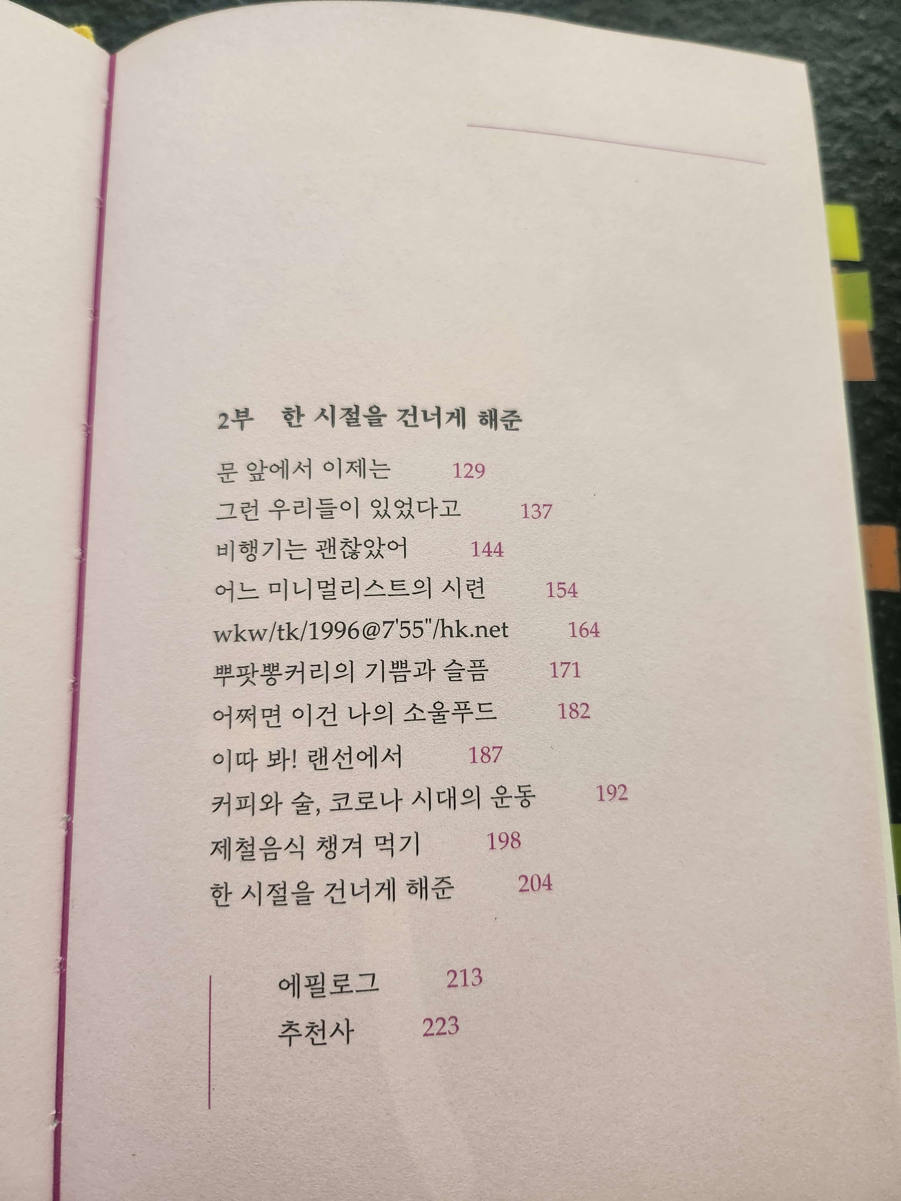 (참고로 그 책 리스트는 김혼비의 다정소감, 김하나의 힘 빼기 기술, 윤가은 호호호, 최민석의 꽈배기의 맛, 꽈배기의 멋, 장기하의 상관없는 거 아닌가?이다.) 모두 꽤 괜찮은 에세이여서 추천하는 바이다.