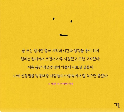 다정소감은 쉬운 마음으로 읽었다가 김혼비 작가에게 입덕되어 그녀의 출판 책들을 모조리 읽어보게 되는 계기가 되었다. 그녀의 시선과 마음그릇이 어떨지 가늠이 되는 책이었다. [조상혐오를 멈춰주세요]와 [책으로 인생이 바뀐다는 것]을 읽다가 혼자서 풋 하고 웃음이 나왔고, [D가 웃으면 나도 좋아]와 [한 시절을 건너게 해 준]을 읽었을 때엔 지금보다 어렸던 시절의 미숙했던 시절의 후회와 그리움, 감사함이 느껴졌다.