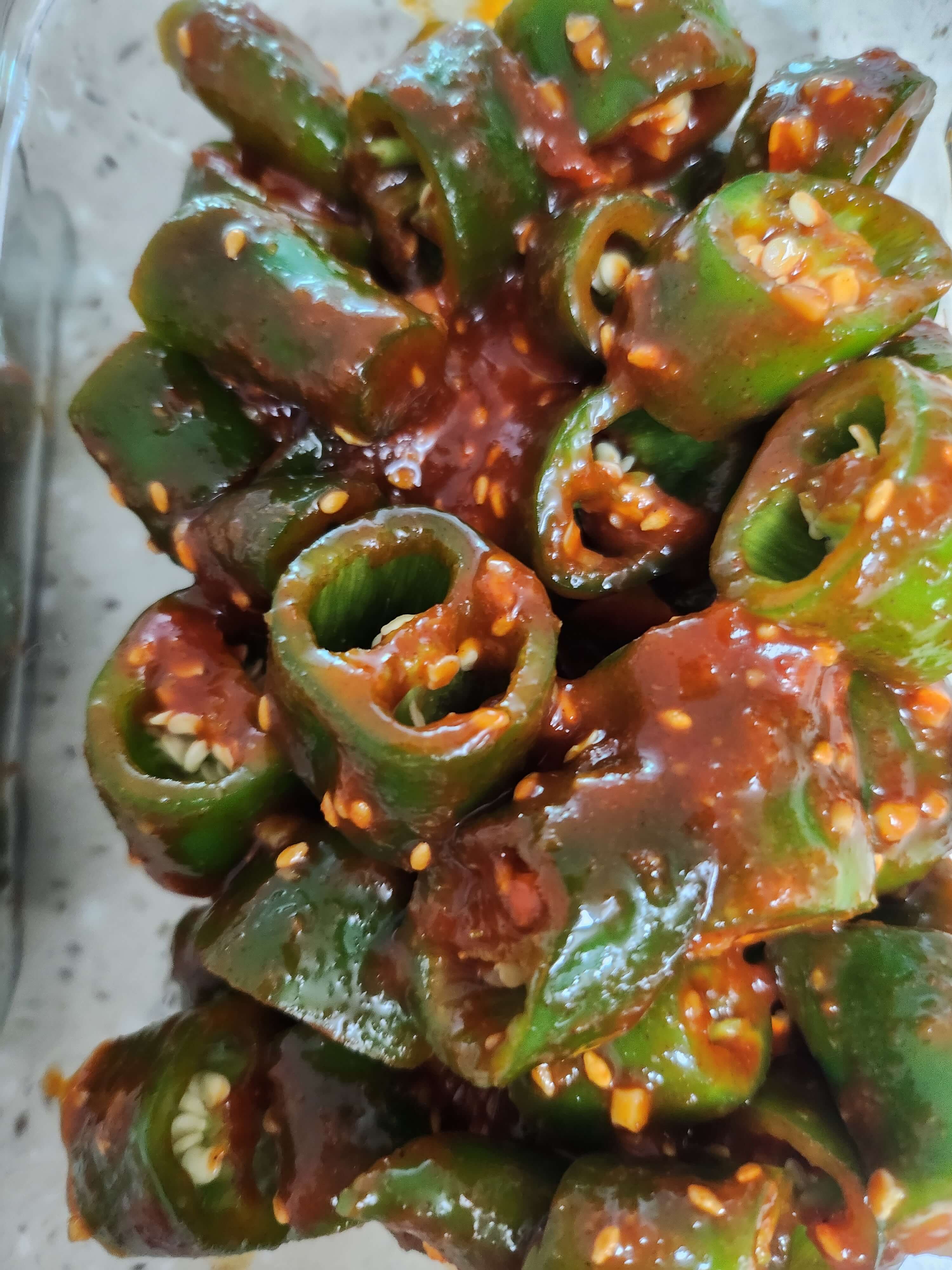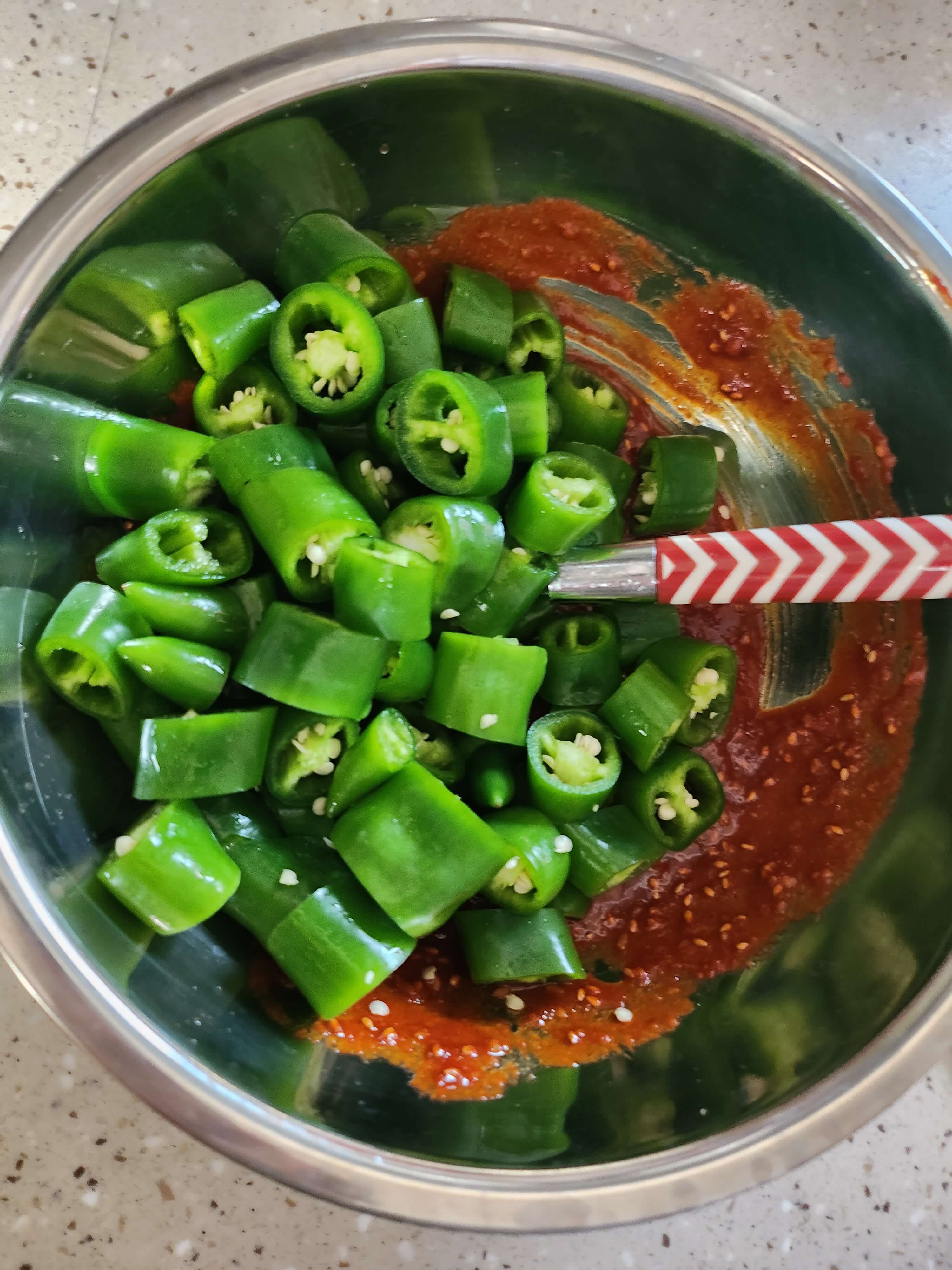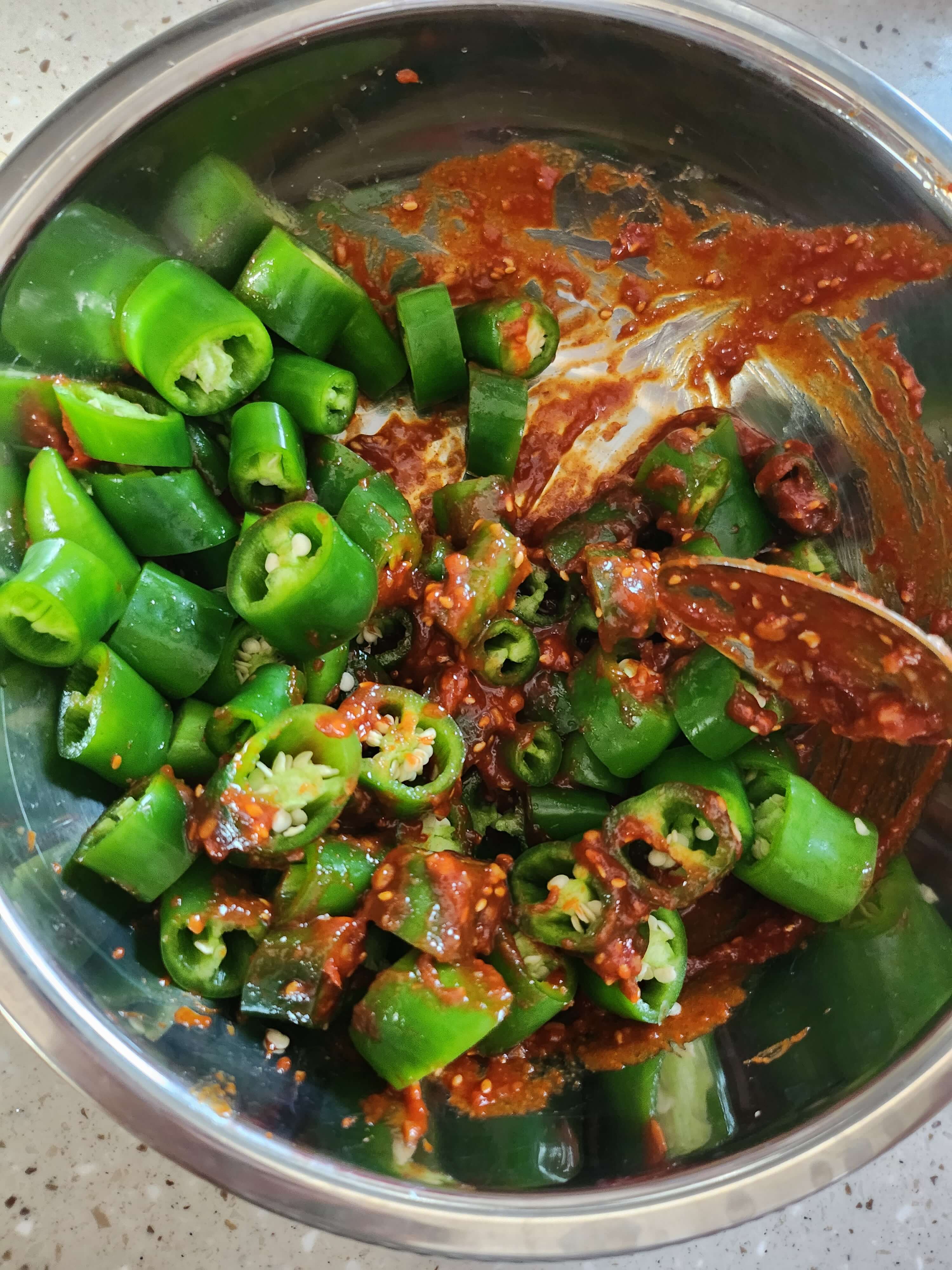 ③ 자른 고추를 준비된 양념장에 넣어 잘 버무려줍니다.