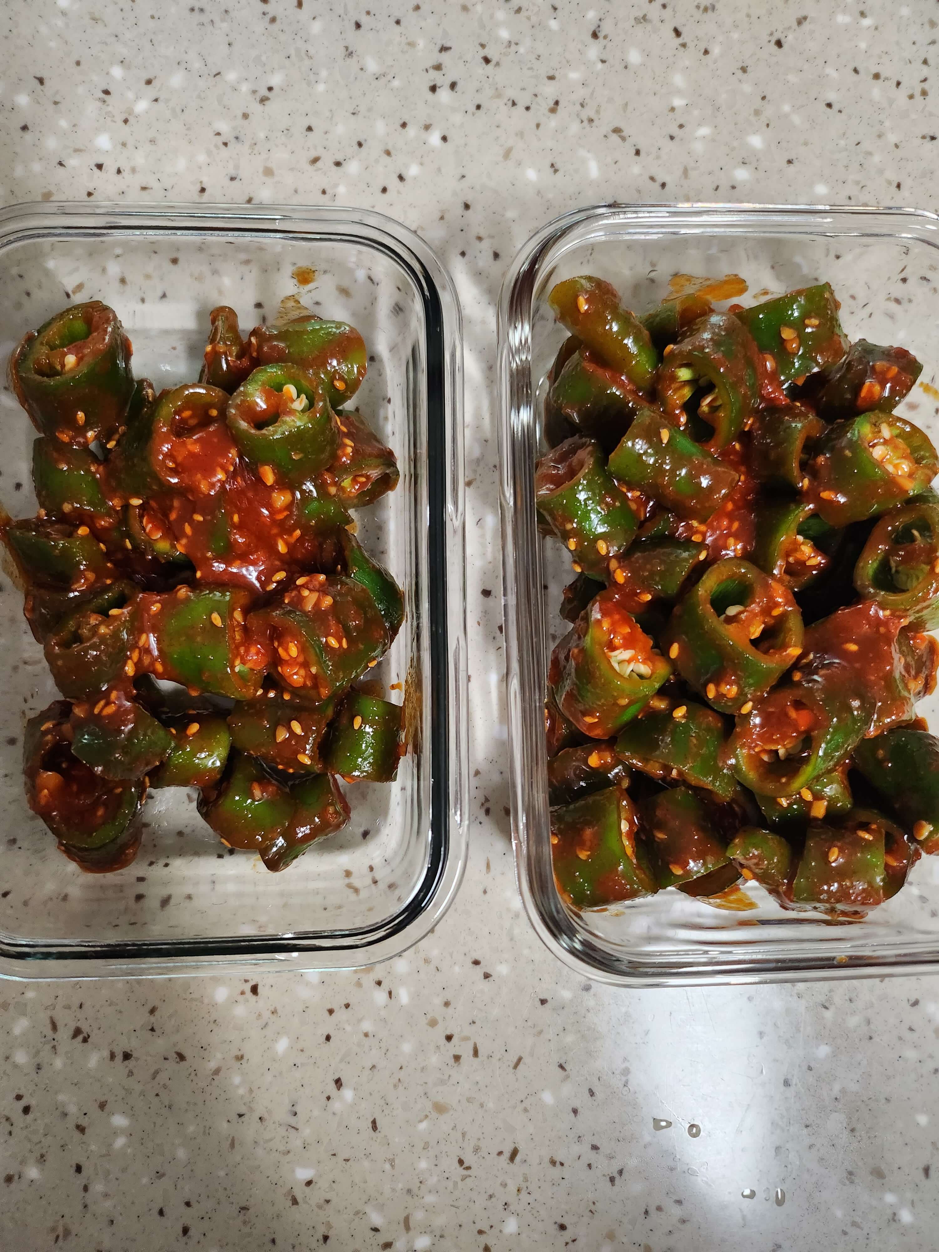 오이고추 10개로 반찬통 2개가 채워지네요. 비타민C가 풍부한 오이고추된장무침 드시고 오늘도 활기차고 건강한 하루 보내세요!