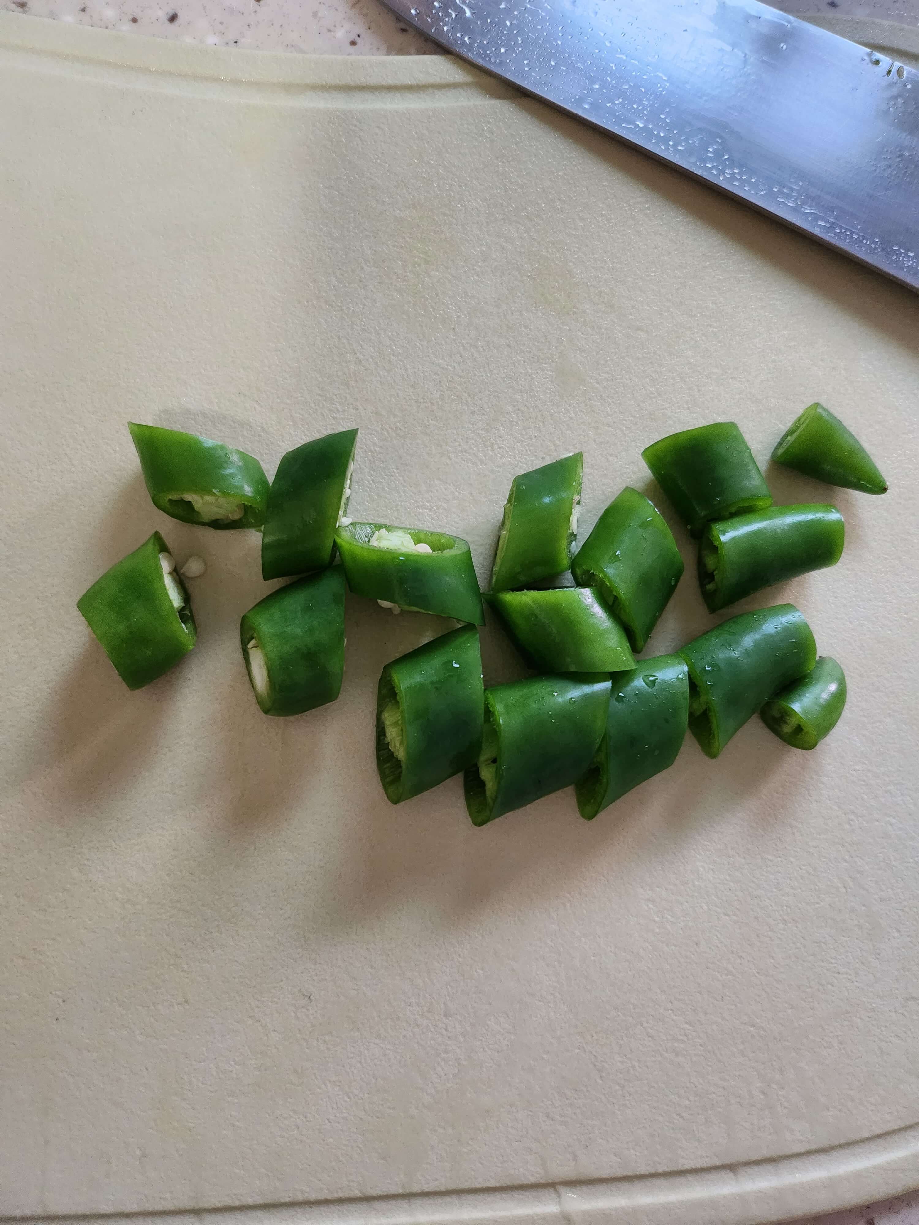 ② 깨끗히 씻은 오이고추는 물기를 제거해서 먹기 좋은 크기로 자르고 씨는 약간 털어서 제거해 주세요