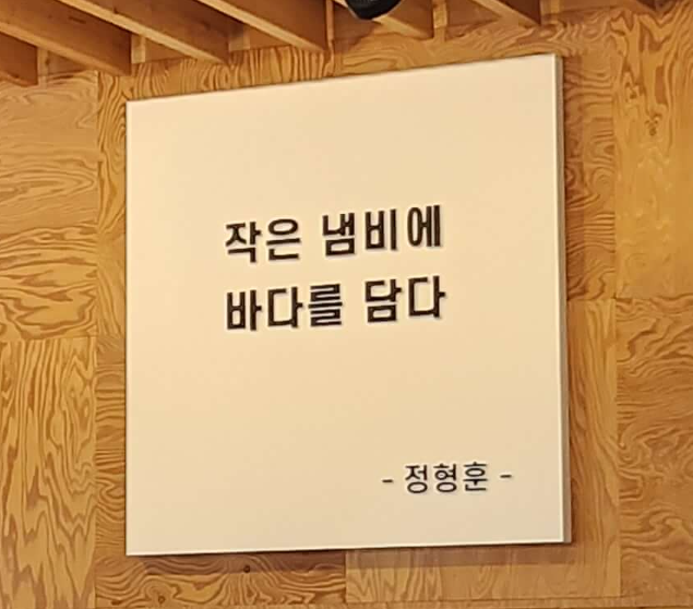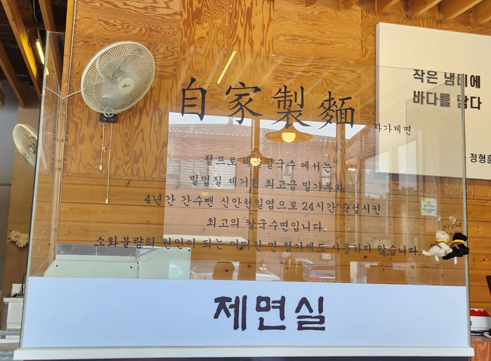 제면실이 카운터에 있었으나 이미 만들어둔 면을 주셨고 그 옆에 작은 냄비에 바다를 담다라는 캐치프라이즈 같은 문구가 적혀있었다. 대기하면서 읽은 후기엔 양은 많은 편이고 해물튀전은 별로였단 글들이 보여 선택한 메뉴는