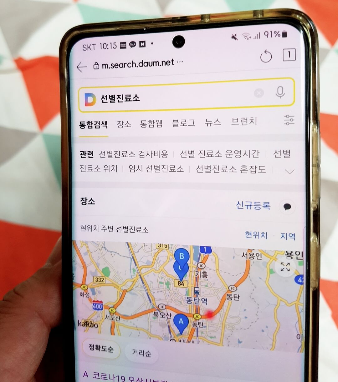 예를 들어 다음 검색창에 선별진료소를 입력합니다. 그러면 검색 화면에 현 위치에서 가까운 선별 진료소를 표시해줍니다.