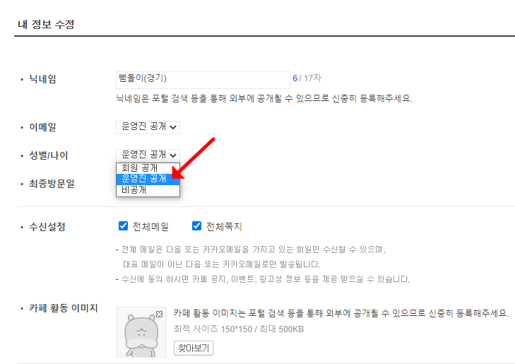 그리고 정회원 등업을 위해서 이메일, 성별/나이 최종 방문일은 운영진 공개로 설정해야 합니다. 설정 방법은 카페 상단에 '내 정보 수정' 을 클릭하시고, 운영진 공개를 선택 후 저장하시면 됩니다. 정회원은 조건이 충족되면 자동 등업이 되지만 내 정보 수정을 운영진 공개로 안 하면 추후에 운영진이 통보 없이 준회원 강등시킬 수 있습니다. 또한 정회원 등업 완료 후 비공개 설정해도 강등될 수 있으니 운영진 공개로 꼭 변경하시기 바랍니다.
