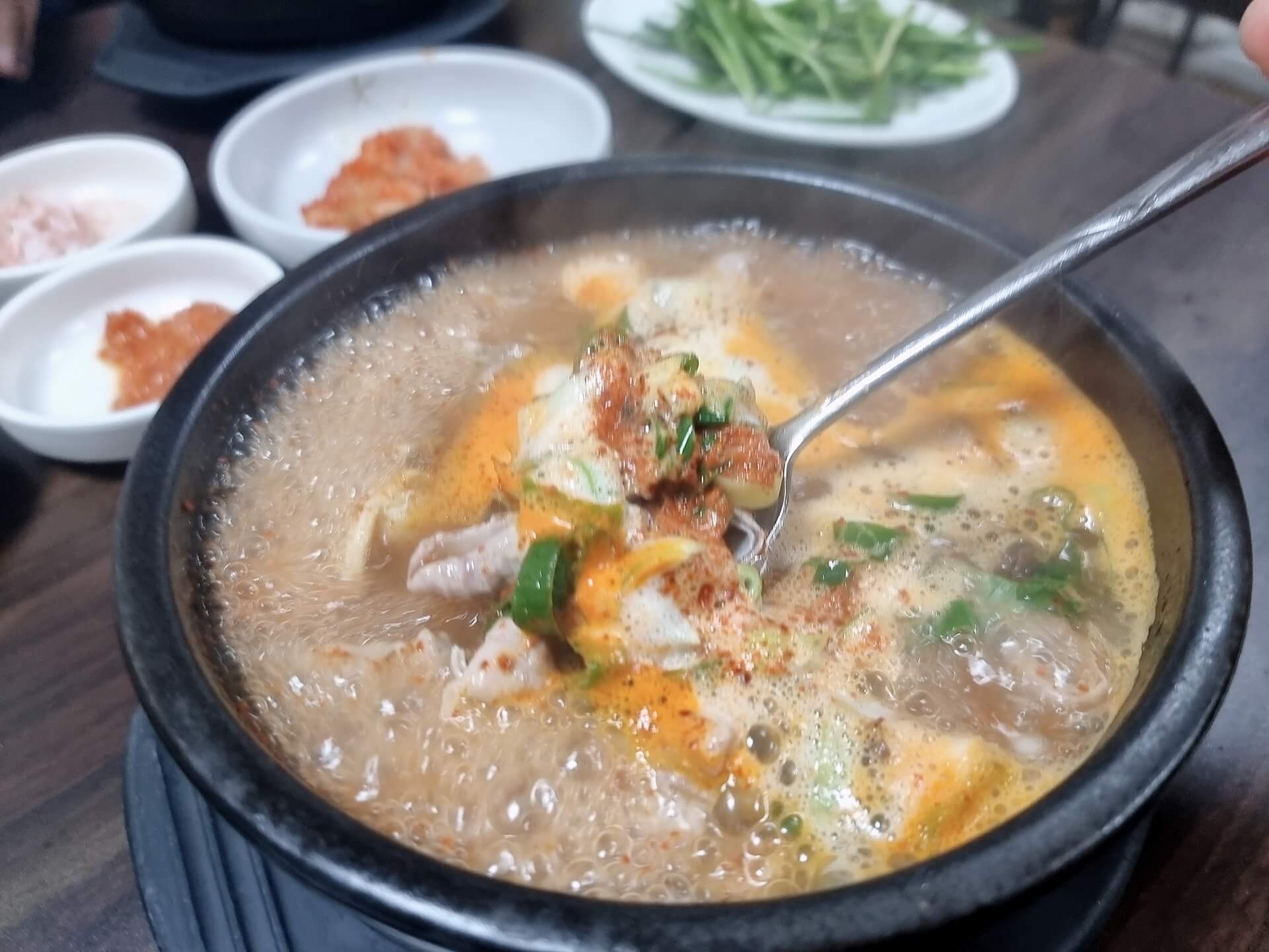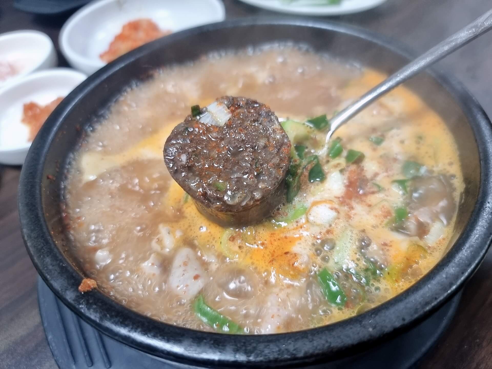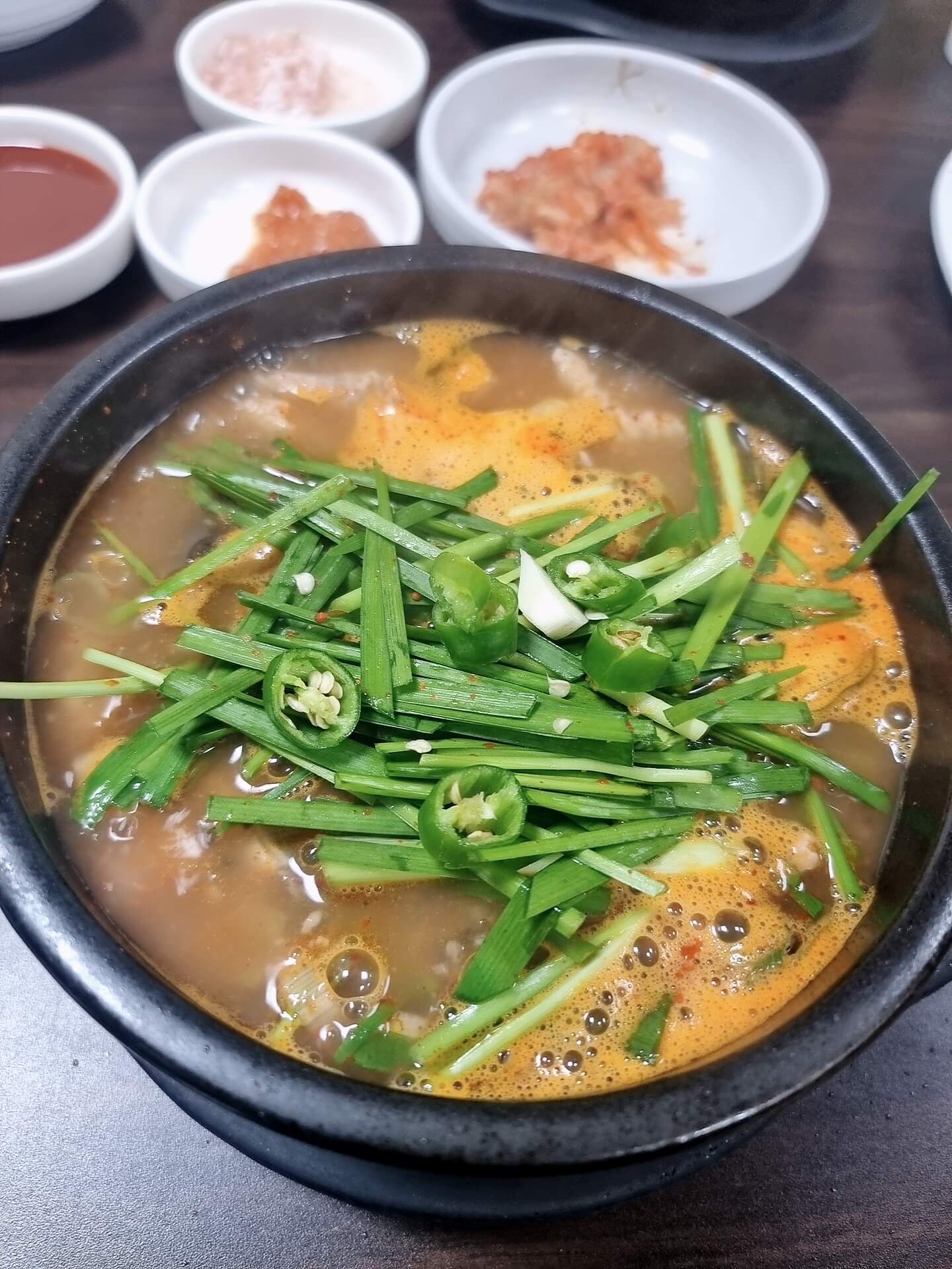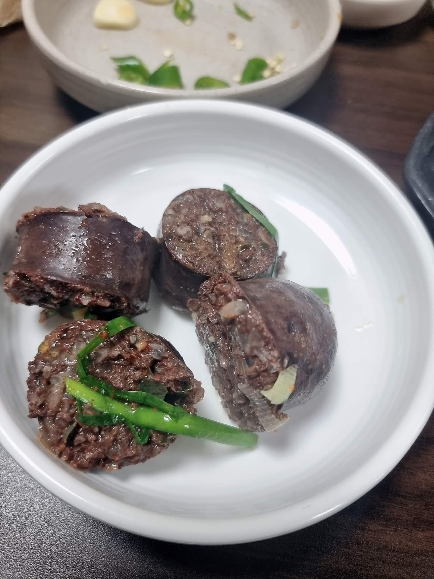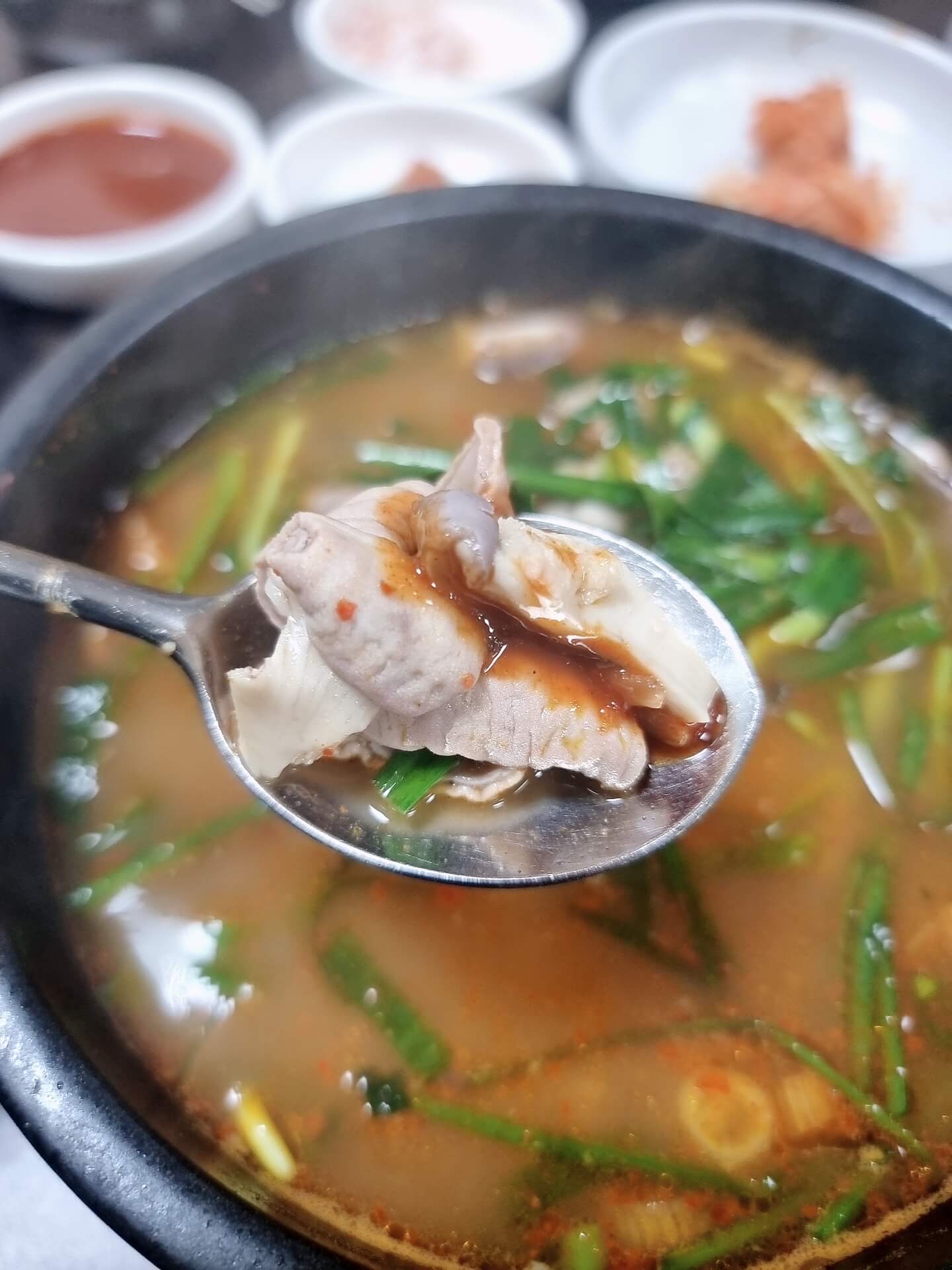 뚝배기에 나온 순대국밥은 엄청 뜨거우니 조심하세요! 함께 나온 부추를 순대국밥에 넣고 취향에 따라 청양고추를 가위로 잘라서 넣으시면 얼큰한 맛이 올라옵니다. 가위는 셀프바에 있습니다. 순대국밥이 뜨거워 피순대만 우선 골라서 빼 두었습니다. 주문하면 나오는 청양고추 엄청 매워요! 제가 갈 때마다 먹어보면 항상 매워서 엄청 고생했어요! 자신 있는 분들만 도전하시고, 아니면 저처럼 가위로 잘라 순대국밥에 넣어 드시길 추천드립니다.