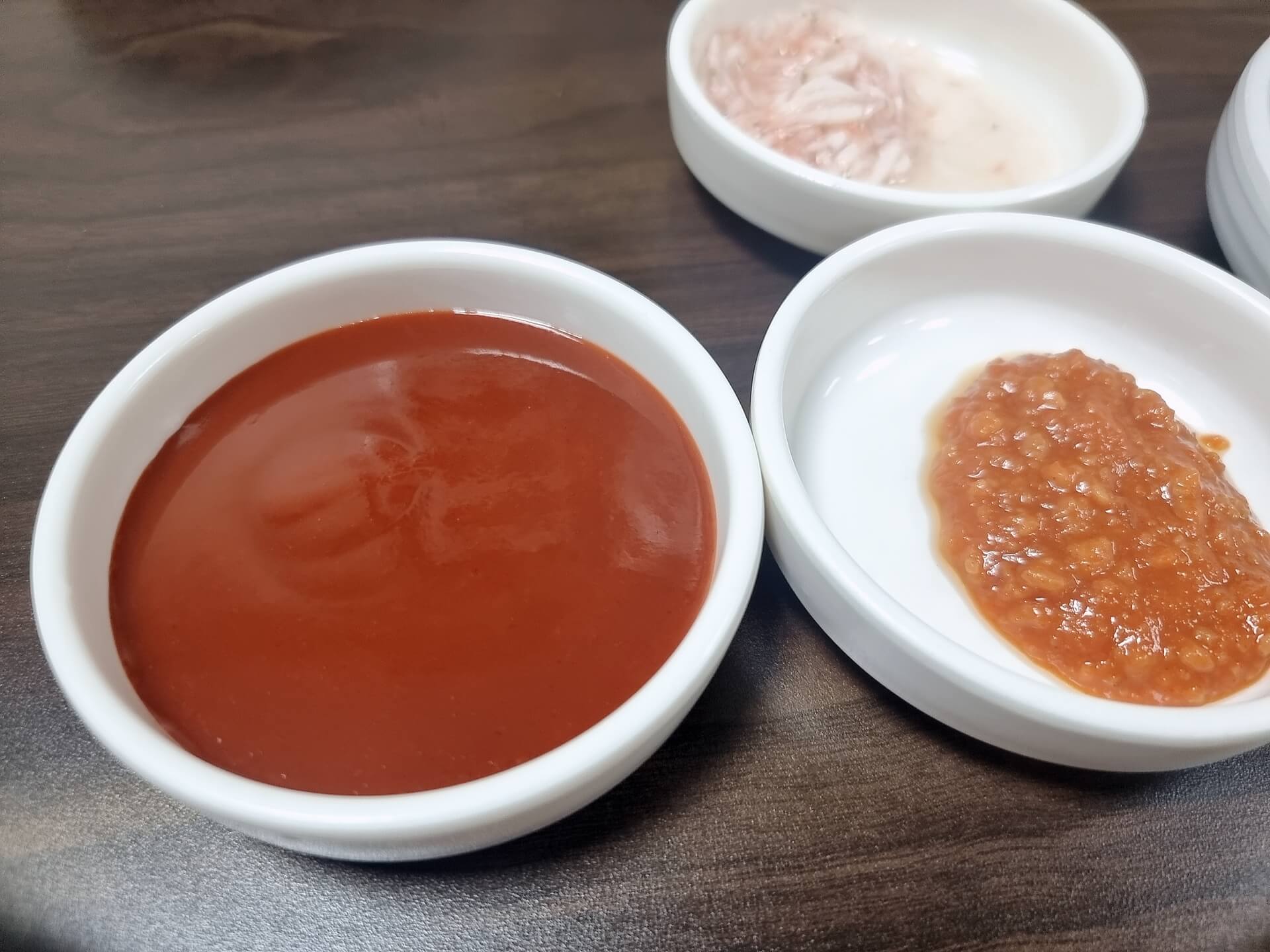 테이블마다 초장이 준비되어 있습니다. 빈 접시 하나에 이렇게 초장을 준비하시면 됩니다.