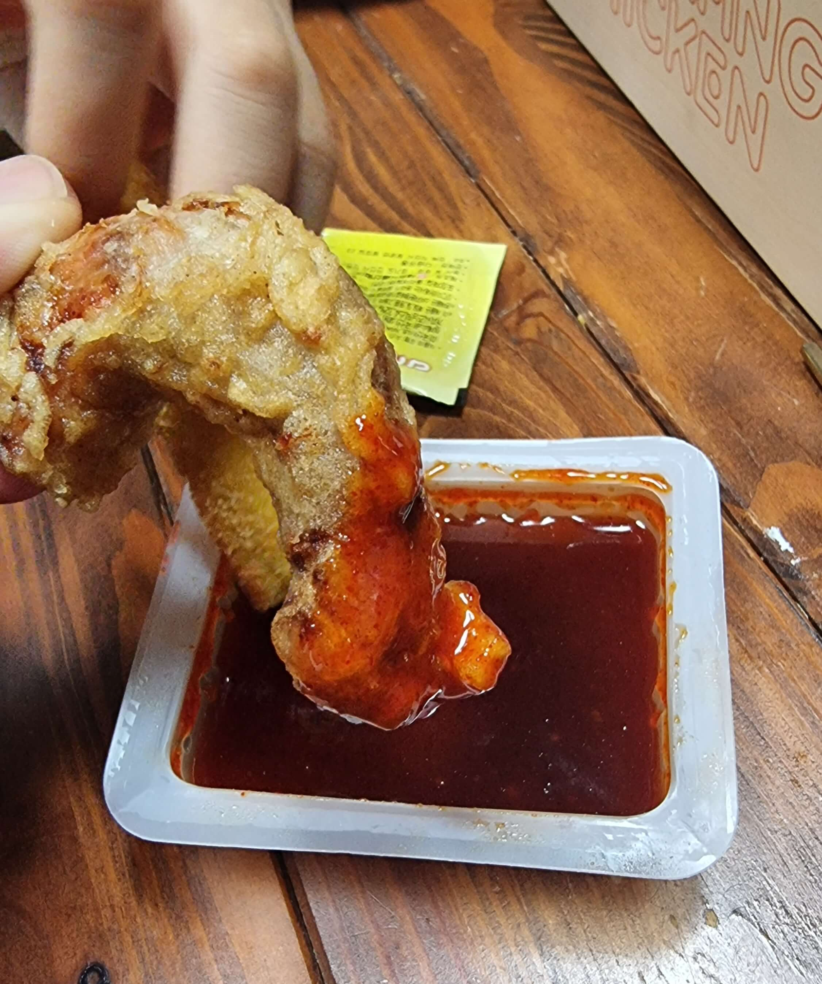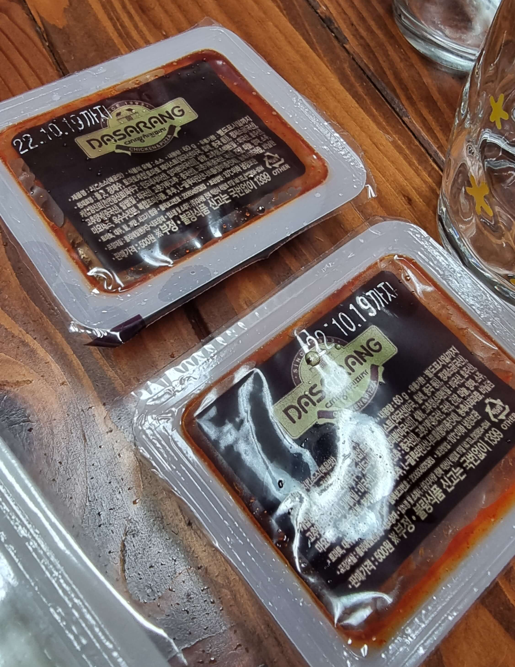 다사랑 치킨 후라이드는 이 소스가 중요합니다. 주문할 때 1개만 오기 때문에 추가로 1개 더 주문하세요! 후라이드에 이 소스를 찍어 먹으면 매콤한 맛도 있고 감칠맛이 있어 치킨 맛을 더 높여줍니다.
