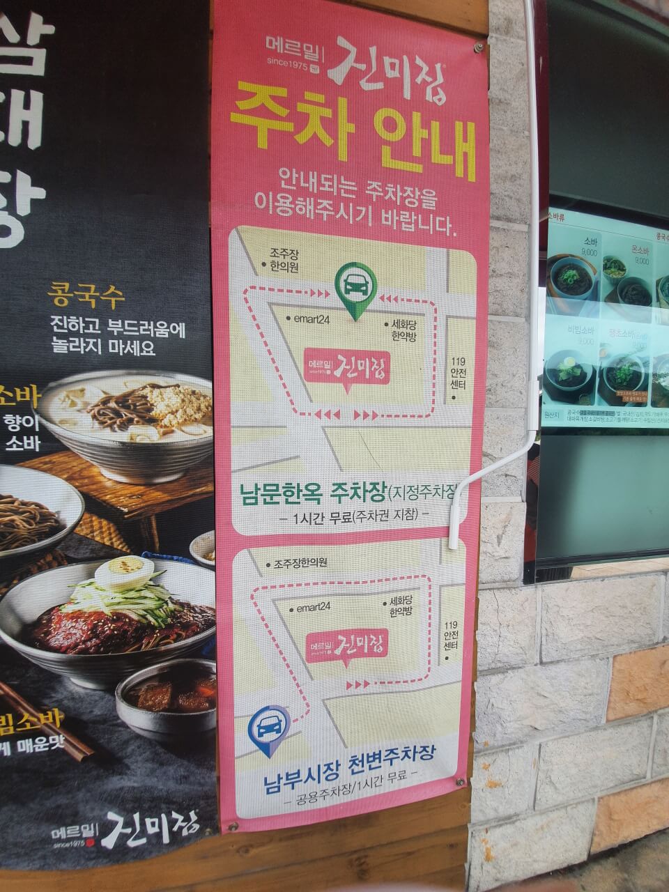 주차는 진미집 뒤편 남문한옥주차장을 이용해도 되고, 만차라면 남부시장 천변 유료주차장을 추천합니다. 1시간 무료라서 부담 없이 이용하실 수 있습니다.