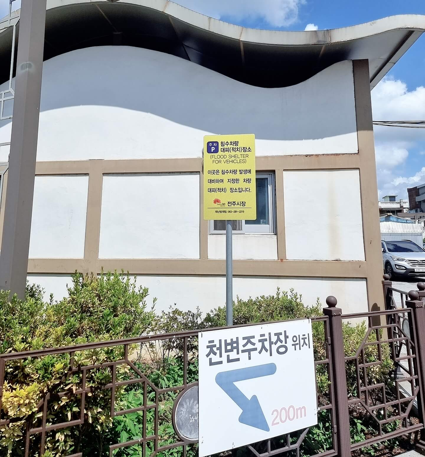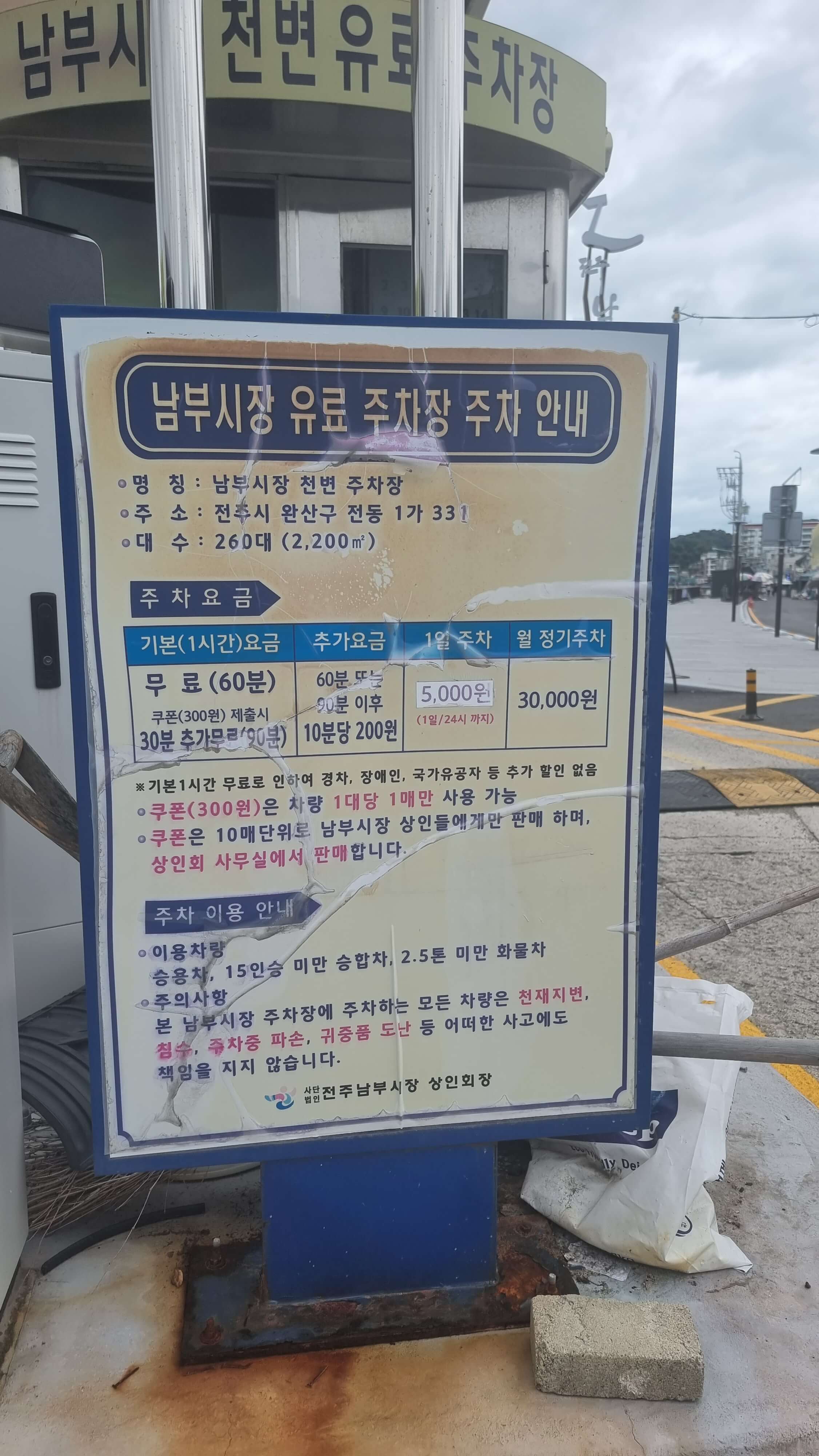 매장 앞에 주차정보가 표시되어 있습니다. 미리 알고 가시는 게 좋습니다. 전주는 여행객들이 많아서 주차 공간이 그렇게 여유롭지 못합니다. 남부시장 천변주차장은 여유가 좀 있지만 거리가 있어 5분 이상 걸어야 하는 단점이 있습니다.