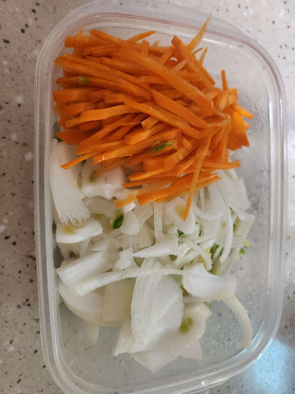 ② 양파, 애호박, 당근을 채썰어 준비하고 있다가 바지락이 입을 벌리면 면과 함께 넣어준다.