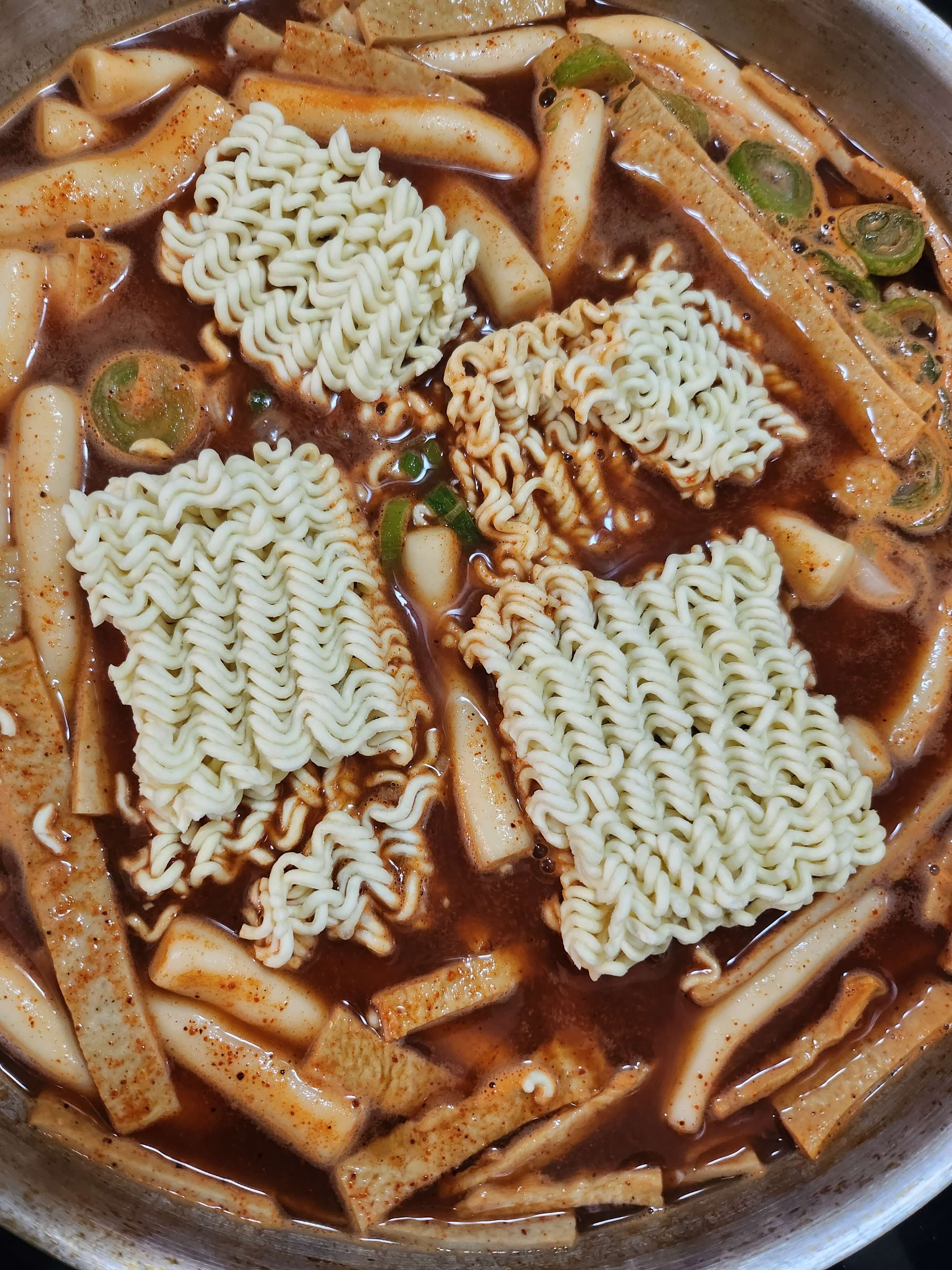 정확히 물양을 개량하여 떡과 어묵, 스프를 넣었는데.... 너무 물이 많아 보이더라고요. 아무리 국물 떡볶이여도 국물양이 지나치게 많다 싶었습니다. 이때 필요한 모다? ㅋㅋ 바로 라면이죠. 면사리 추가는 사랑입니다.