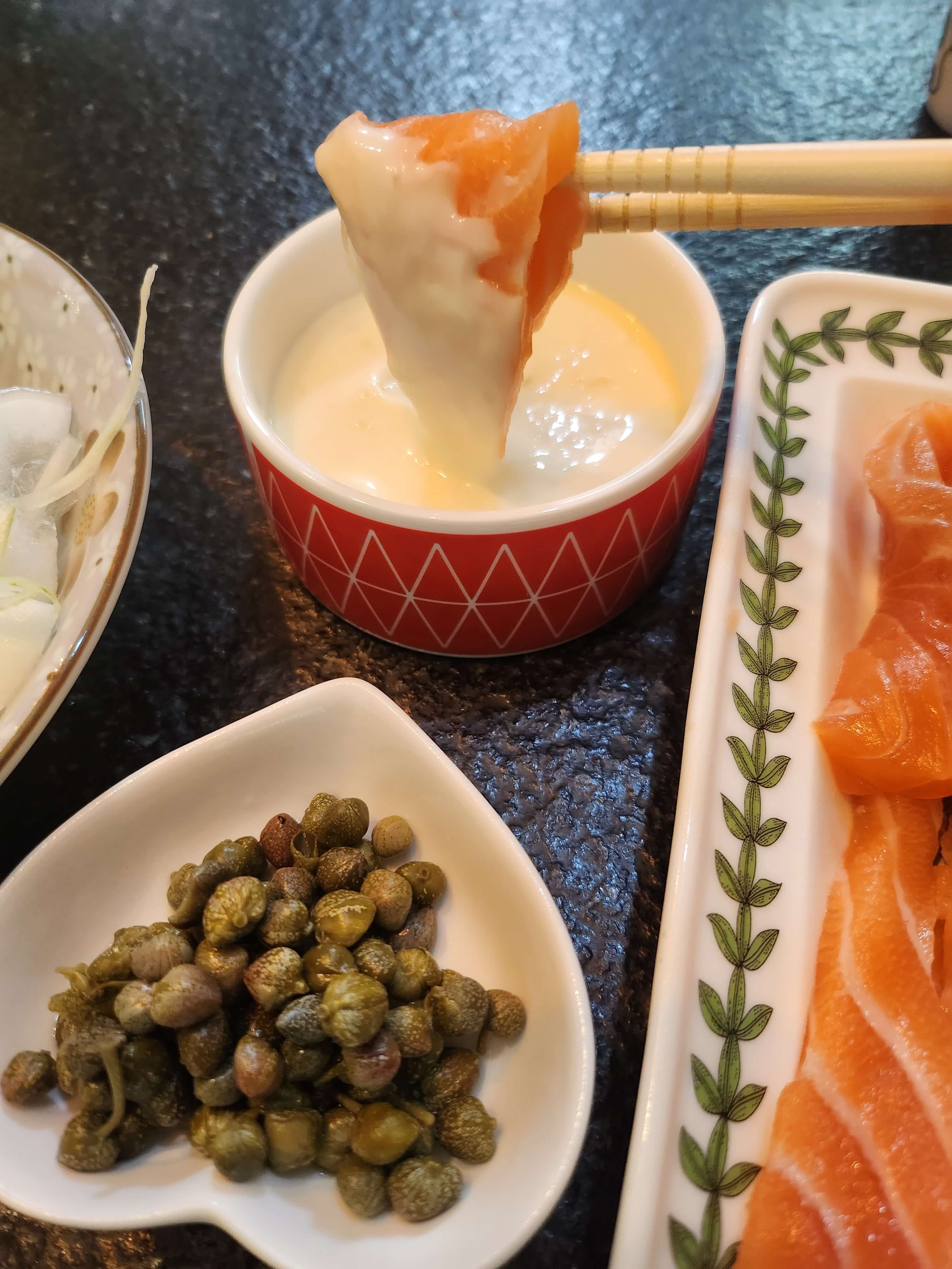 개인적으로 전 두툼하게 썰은 연어회에 소스 듬뿍, 케이퍼와 양파를 올려 먹는게 최고였습니다.